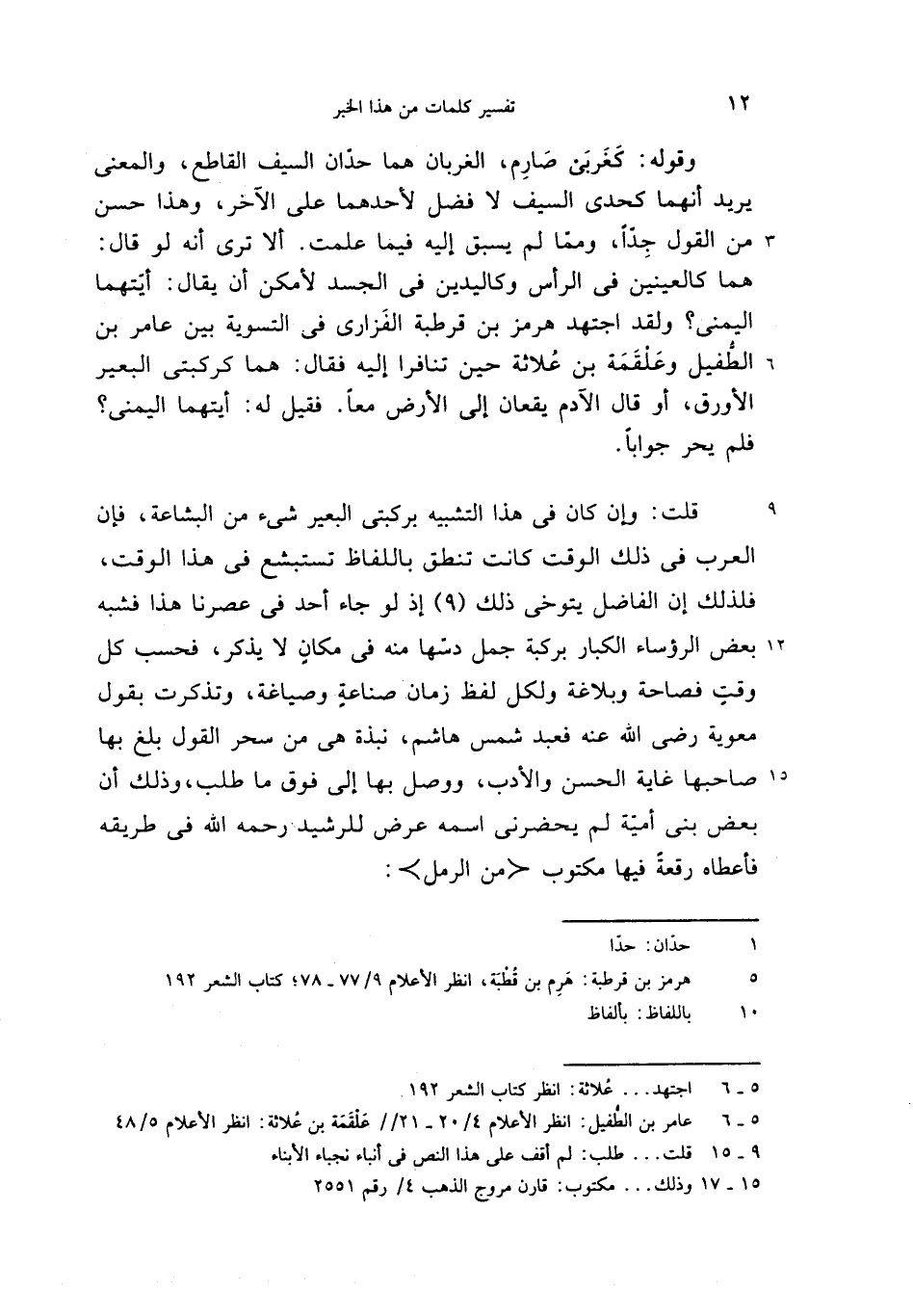 قلت: وإن كان فى هذا التشبيه بركبتى البعير شئ من البشاعة، فإن العرب في ذلك الوقت كانت تنطق باللفاظ تستبشع فى هذا الوقت، فلذلك إن الفاضل يتوخى ذلك (9) إذ لو جاء أحد فى عصرنا هذا فشبه بعض الرؤساء الكبار بركبة جمل دسّها منه فى مكان لا يذكر، فحسب كل وقت فصاحة وبلاغة ولكل لفظ زمان صناعة وصياغة، وتذكرت بقول معوية رضى الله عنه فعبد شمس هاشم، نبذة هى من سحر القول بلغ بها صاحبها غاية الحسن والأدب، ووصل بها إلى فوق ما طلب، وذلك أن بعض بنى أميّة لم يحضرنى اسمه عرض للرشيد رحمه الله فى طريقه فأعطاه رقعة فيها مكتوب <من الرمل>: