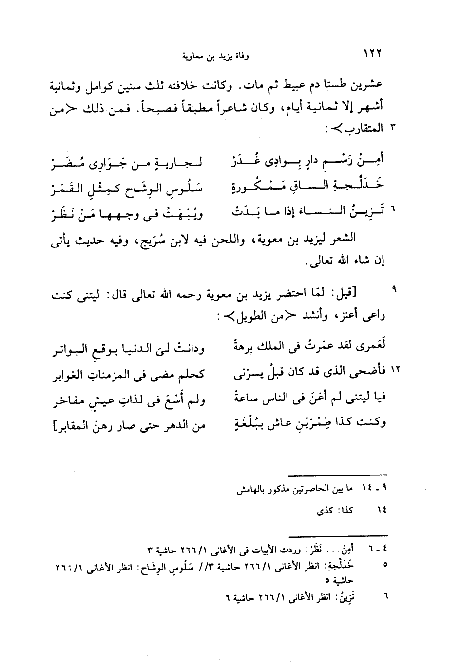 [قيل: لمّا احتضر يزيد بن معوية رحمه الله تعالى قال: ليتنى كنت راعى أعنز، وأنشد <من الطويل>: