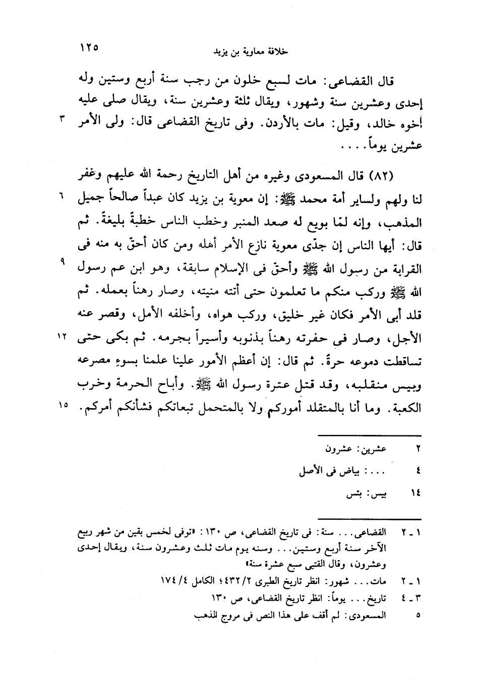 (1 - 2) القضاعى. . . سنة: فى تاريخ القضاعى، ص 130: «توفى لخمس بقين من شهر ربيع الآخر سنة أربع وستين. . . وسنه يوم مات ثلث وعشرون سنة، ويقال إحدى وعشرون، وقال القتبى سبع عشرة سنة»