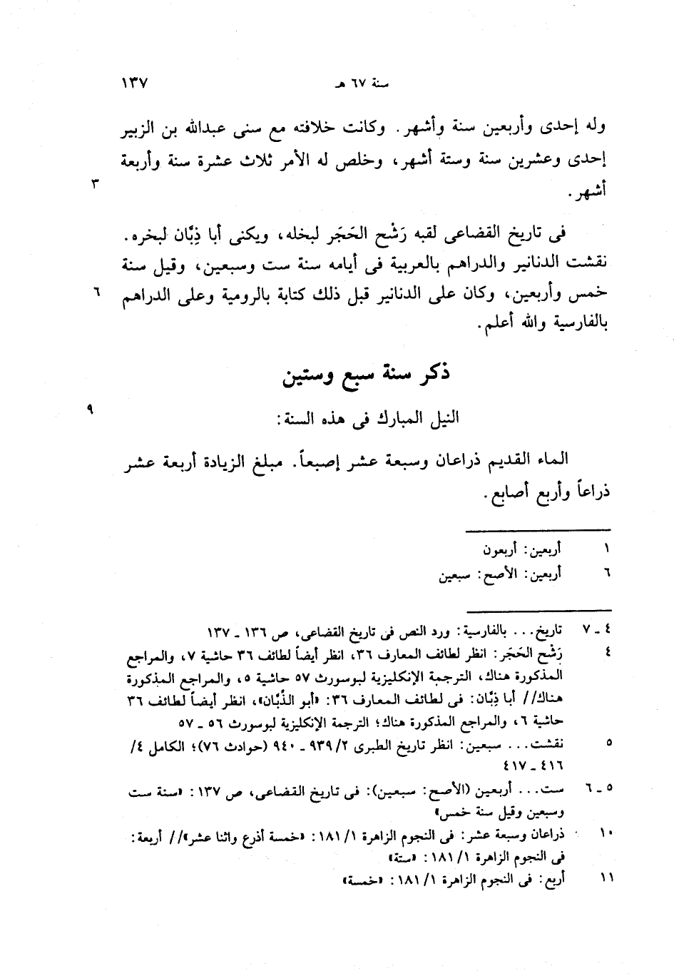 (5 - 6) ست. . . أربعين (الأصح: سبعين): فى تاريخ القضاعى، ص 137: «سنة ست وسبعين وقيل سنة خمس»
