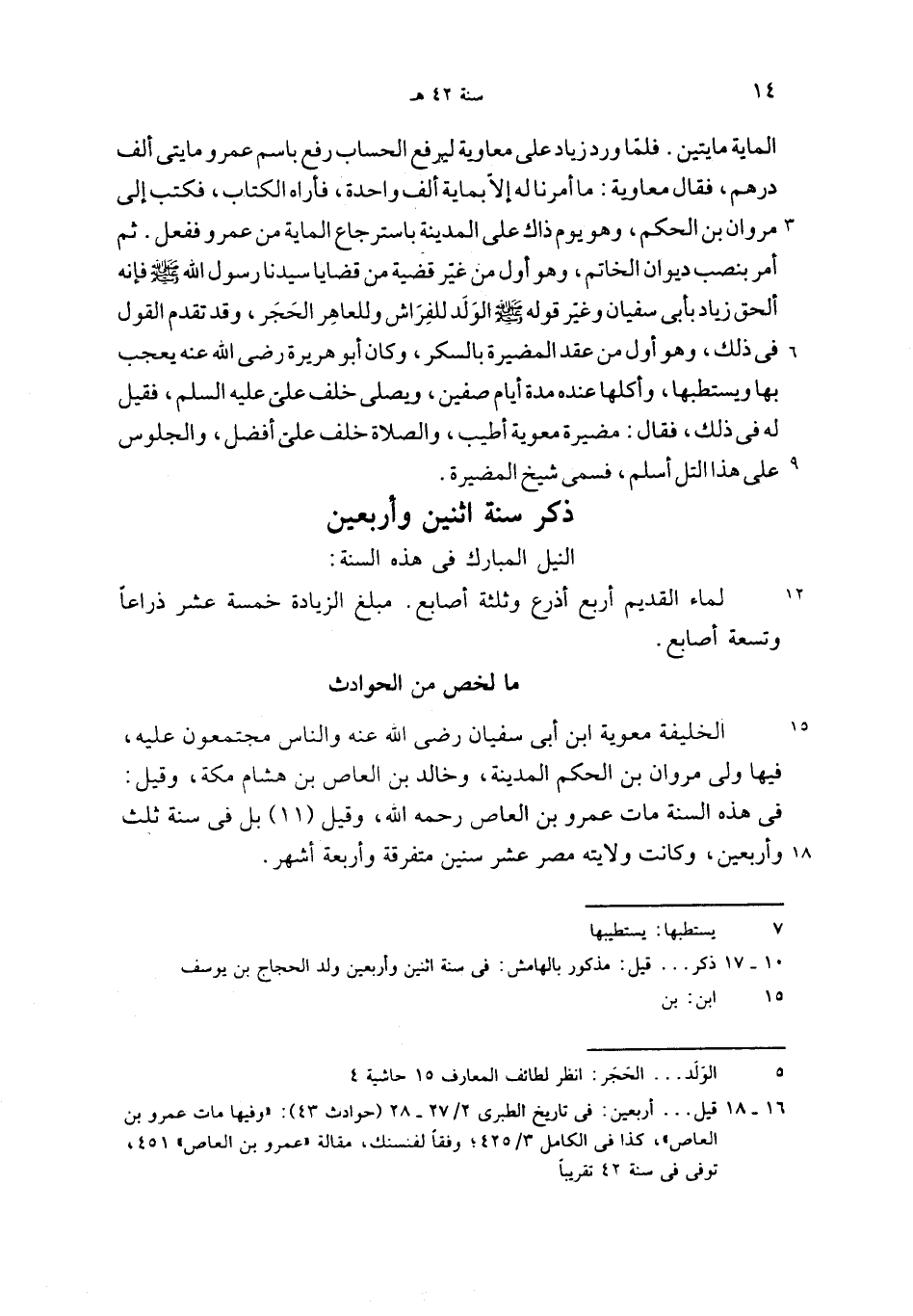 (16 - 18) قيل. . . أربعين: فى تاريخ الطبرى 2/ 27 - 28 (حوادث 43): «وفيها مات عمرو بن العاص»، كذا فى الكامل 3/ 425؛ وفقا لفنسنك؟؟؟، مقالة «عمرو بن العاص» 451، توفى فى سنة 42 تقريبا