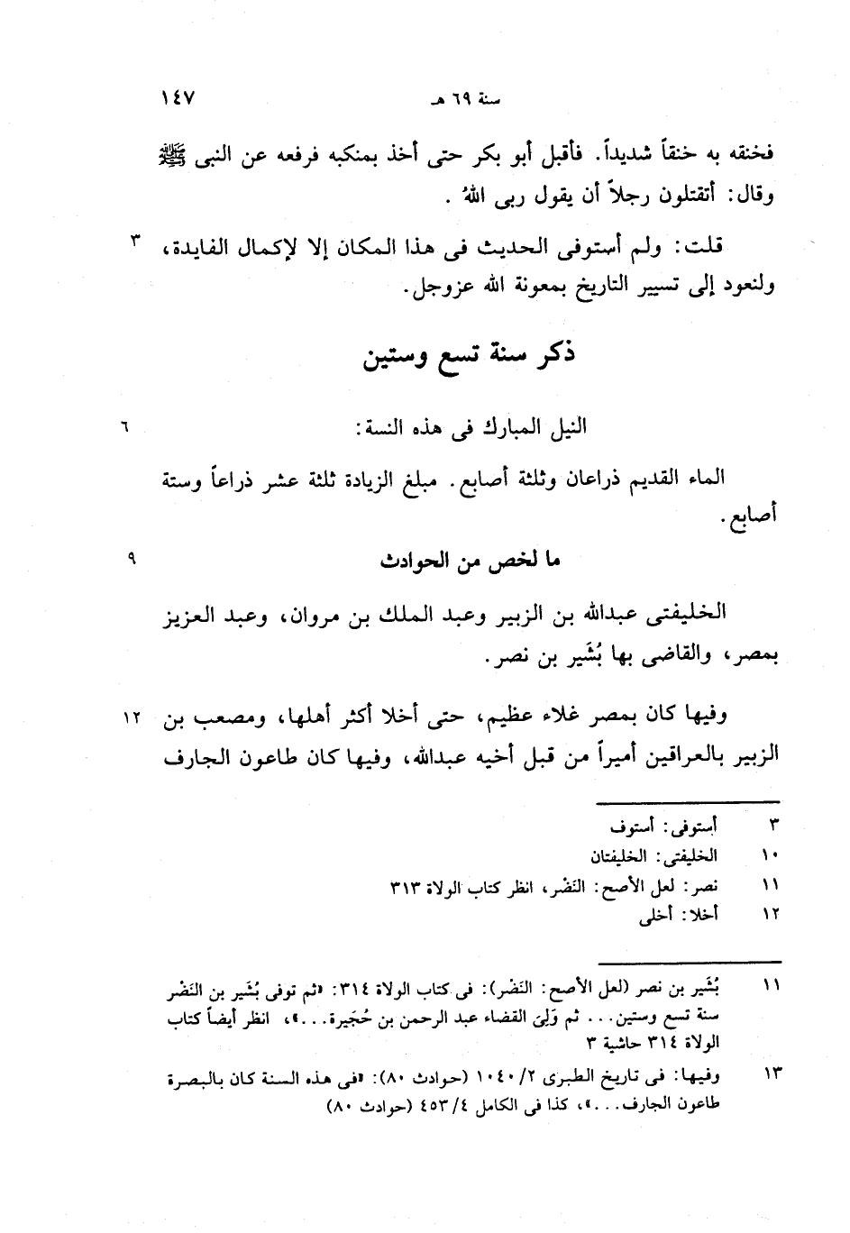 (11) بشير بن نصر (لعل الأصح: النضر): فى كتاب الولاة 314: «ثم توفى بشير بن النضر سنة تسع وستين. . . ثم ولى القضاء عبد الرحمن بن حجيرة. . .»، انظر أيضا كتاب الولاة 314 حاشية 3