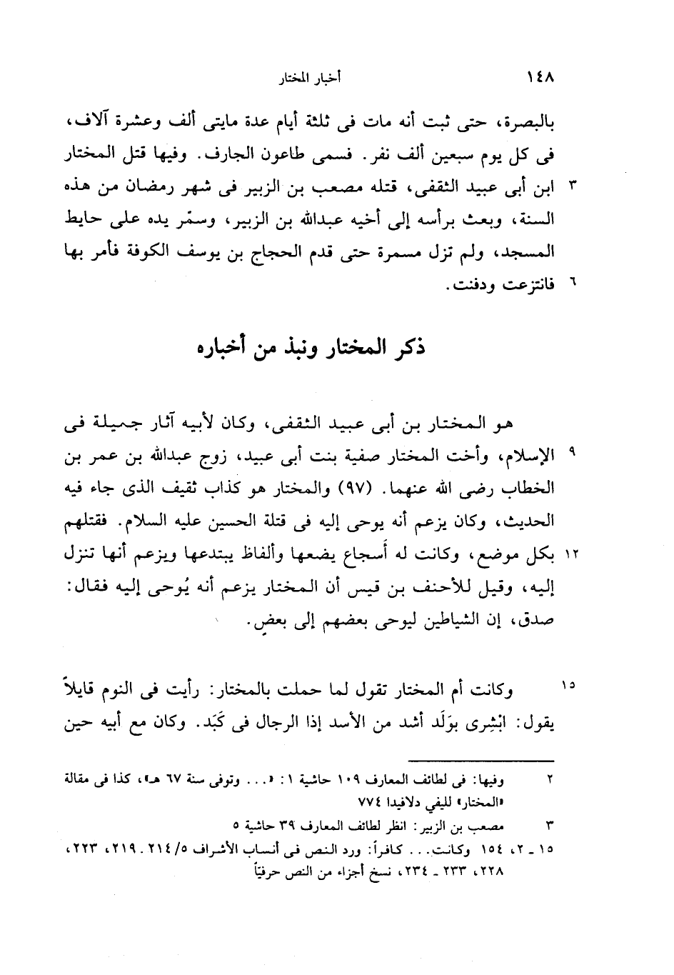 هو المختار بن أبى عبيد الثقفى، وكان لأبيه آثار جميلة فى الإسلام، وأخت المختار صفية بنت أبى عبيد، زوج عبد الله بن عمر بن الخطاب رضى الله عنهما. (97) والمختار هو كذاب ثقيف الذى جاء فيه الحديث، وكان يزعم أنه يوحى إليه فى قتلة الحسين عليه السلام. فقتلهم بكل موضع، وكانت له أسجاع يضعها وألفاظ يبتدعها ويزعم أنها تنزل إليه، وقيل للأحنف بن قيس أن المختار يزعم أنه يوحى إليه فقال: