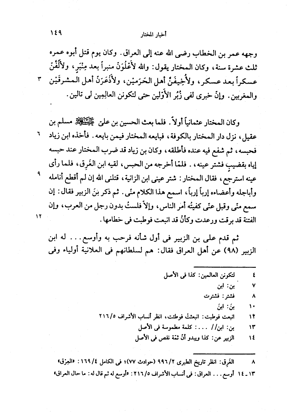 وجهه عمر بن الخطاب رضى الله عنه إلى العراق. وكان يوم قتل أبوه عمره ثلث عشرة سنة، وكان المختار يقول: والله لأعلونّ منبرا بعد منبر، ولألفّنّ عسكرا بعد عسكر، ولأخيفنّ أهل الحرمين، ولأذعرنّ أهل المشرقين والمغربين. وإنّ خبرى لفى زبر الأوّلين حتى لتكونن العالمين لى تالين.