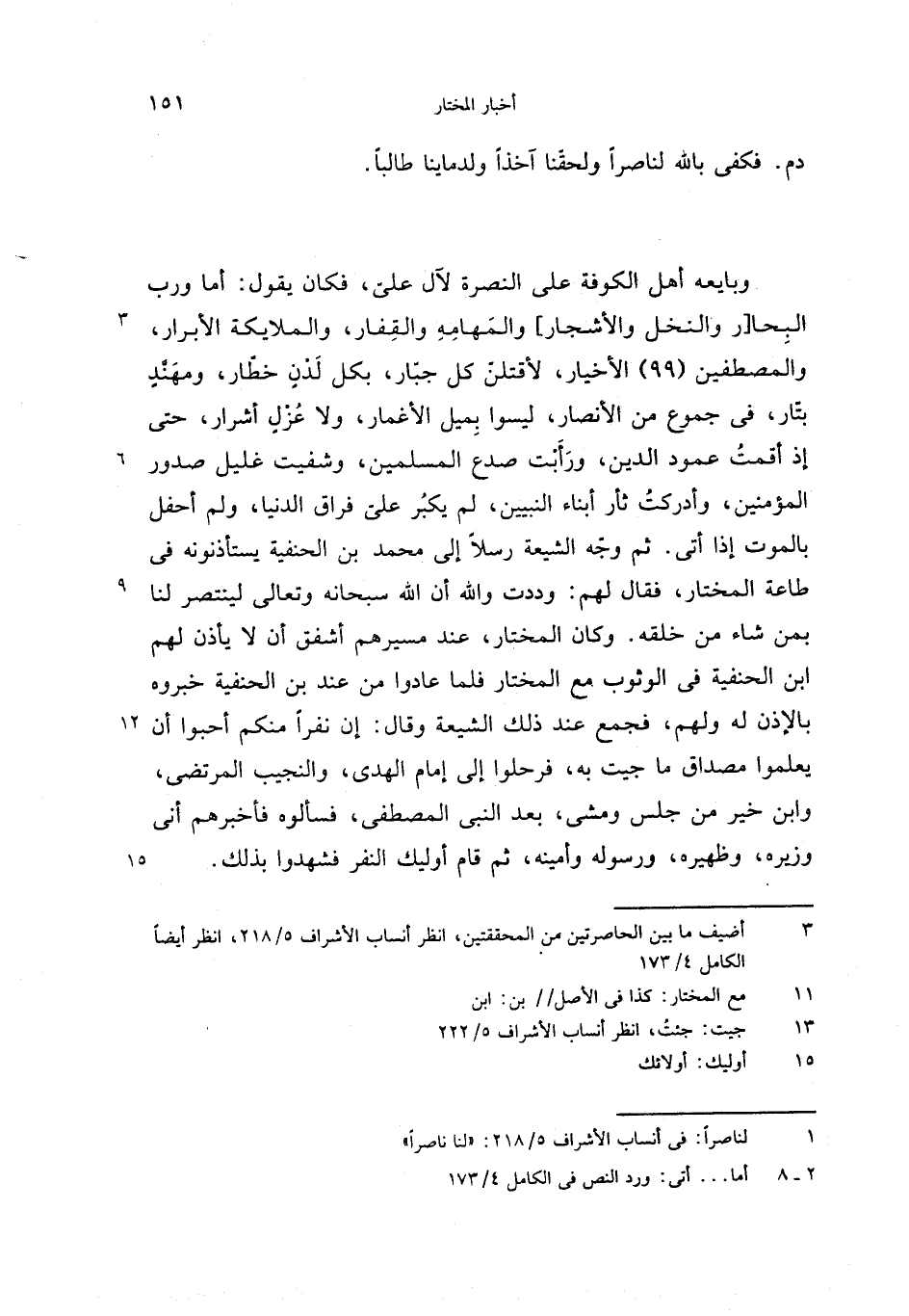 وبايعه أهل الكوفة على النصرة لآل علىّ، فكان يقول: أما ورب البحا [ر والنخل والأشجار] والمهامه والقفار، والملايكة الأبرار، والمصطفين (99) الأخيار، لأقتلنّ كل جبّار، بكل لدن خطّار، ومهنّد بتّار، فى جموع من الأنصار، ليسوا بميل الأغمار، ولا عزل أشرار، حتى إذ أقمت عمود الدين، ورأبت صدع المسلمين، وشفيت غليل صدور المؤمنين، وأدركت ثأر أبناء النبيين، لم يكبر علىّ فراق الدنيا، ولم أحفل بالموت إذا أتى. ثم وجّه الشيعة رسلا إلى محمد بن الحنفية يستأذنونه فى طاعة المختار، فقال لهم: وددت والله أن الله سبحانه وتعالى لينتصر لنا بمن شاء من خلقه. وكان المختار، عند مسيرهم أشفق أن لا يأذن لهم ابن الحنفية فى الوثوب مع المختار فلما عادوا من عند بن الحنفية خبروه بالإذن له ولهم، فجمع عند ذلك الشيعة وقال: إن نفرا منكم أحبوا أن يعلموا مصداق ما جيت به، فرحلوا إلى إمام الهدى، والنجيب المرتضى، وابن خير من جلس ومشى، بعد النبى المصطفى، فسألوه فأخبرهم أنى وزيره، وظهيره، ورسوله وأمينه، ثم قام أوليك النفر فشهدوا بذلك.