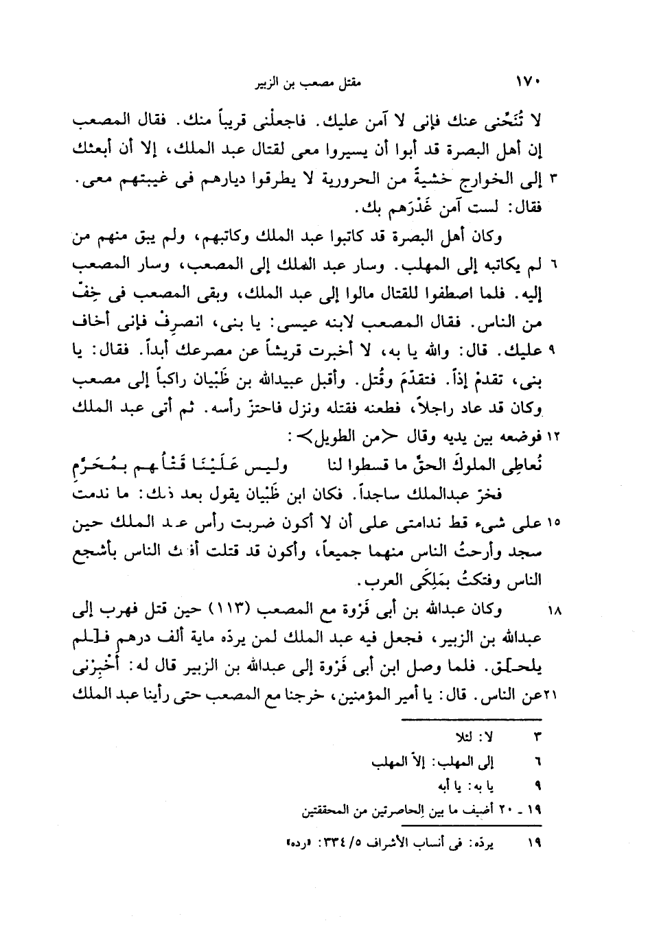 لا تنحّنى عنك فإنى لا آمن عليك. فاجعلنى قريبا منك. فقال المصعب إن أهل البصرة قد أبوا أن يسيروا معى لقتال عبد الملك، إلا أن أبعثك إلى الخوارج خشية من الحرورية لا يطرقوا ديارهم فى غيبتهم معى.