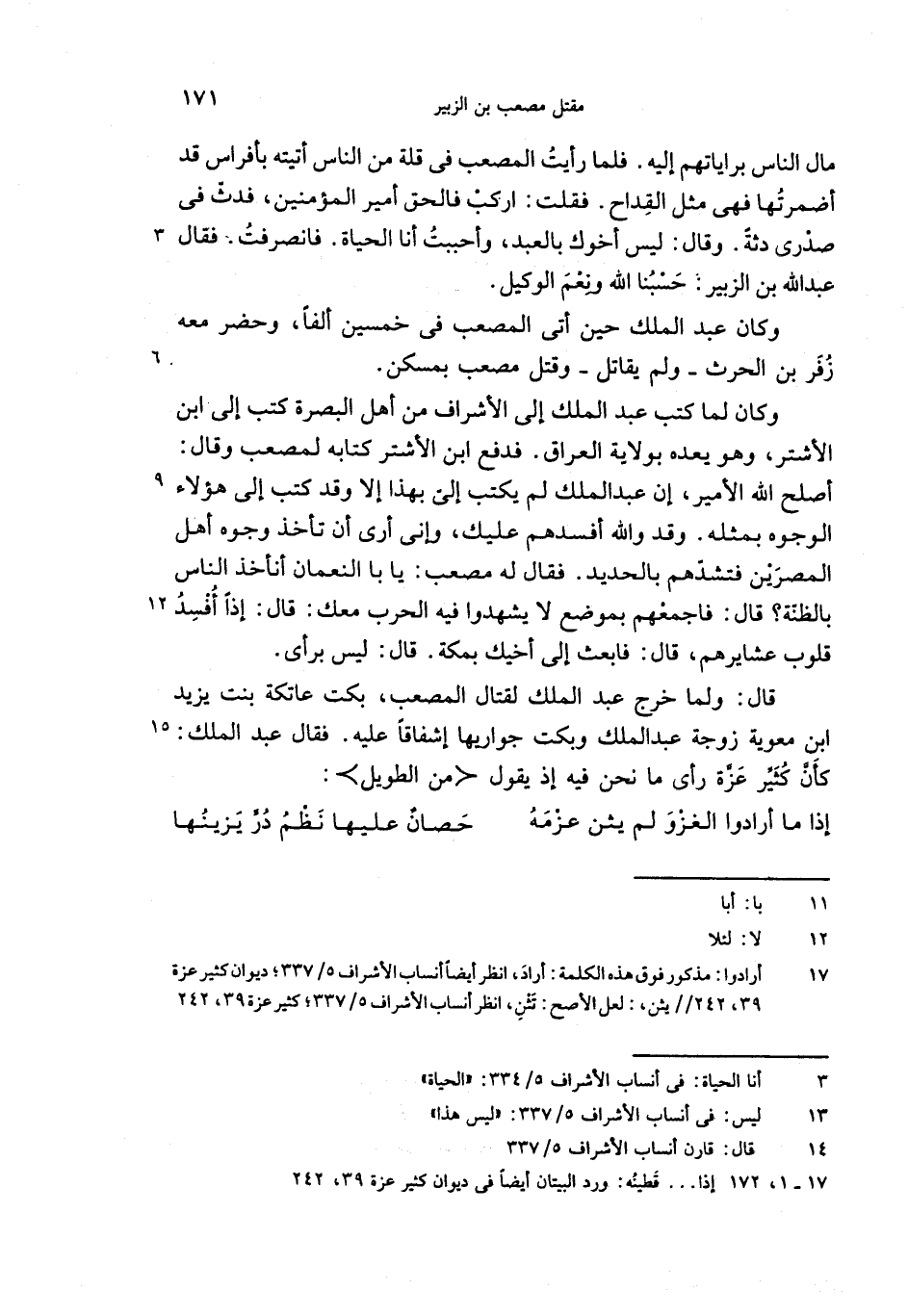 أصلح الله الأمير، إن عبد الملك لم يكتب إلىّ بهذا إلا وقد كتب إلى هؤلاء الوجوه بمثله. وقد والله أفسدهم عليك، وإنى أرى أن تأخذ وجوه أهل المصرين فتشدّهم بالحديد. فقال له مصعب: يا با النعمان أنأخذ الناس بالظنّة؟ قال: فاجمعهم بموضع لا يشهدوا فيه الحرب معك: قال: إذا أفسد قلوب عشايرهم، قال: فابعث إلى أخيك بمكة. قال: ليس برأى.
