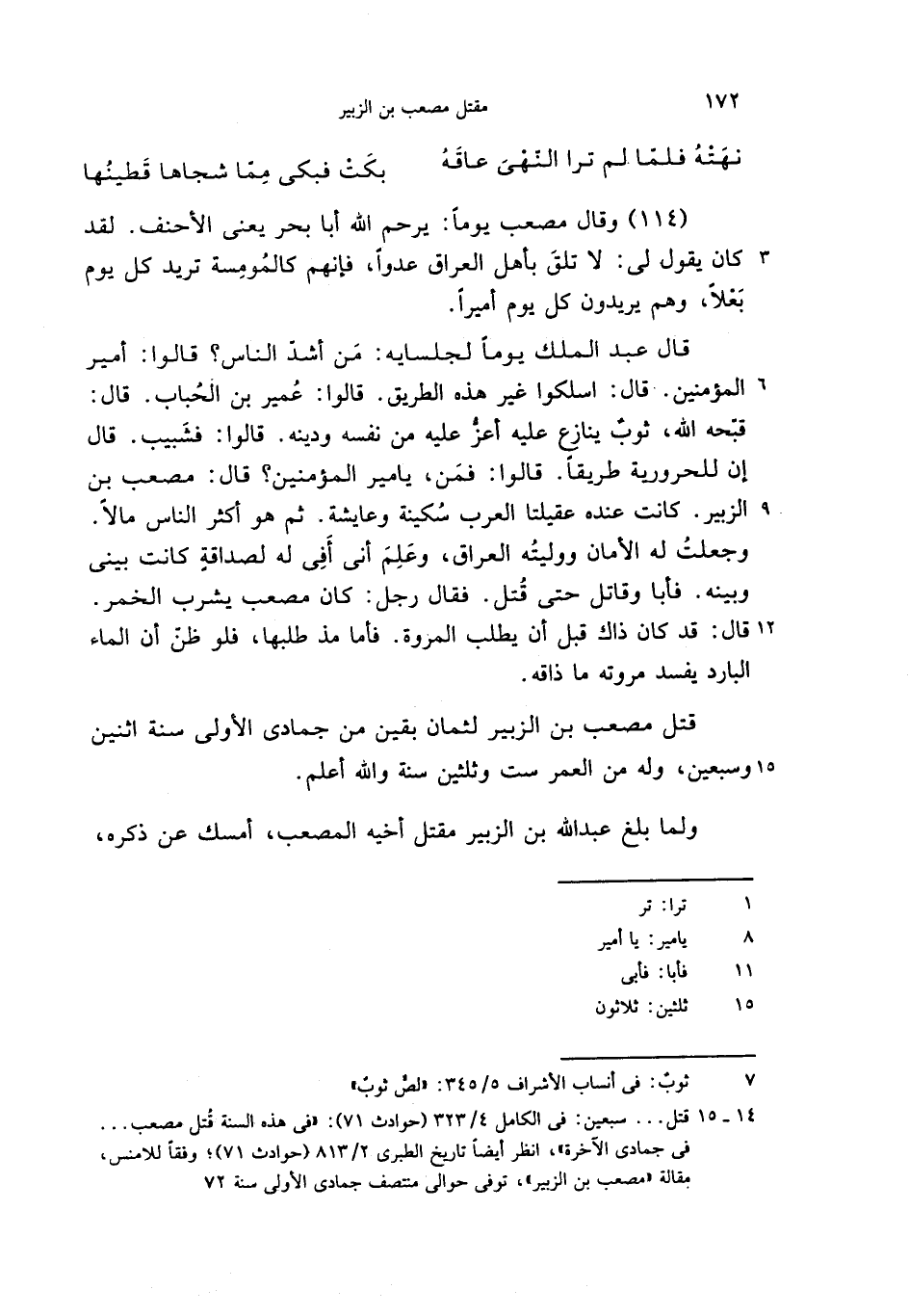 (114) وقال مصعب يوما: يرحم الله أبا بحر يعنى الأحنف. لقد كان يقول لى: لا تلق بأهل العراق عدوا، فإنهم كالمومسة تريد كل يوم بعلا، وهم يريدون كل يوم أميرا.