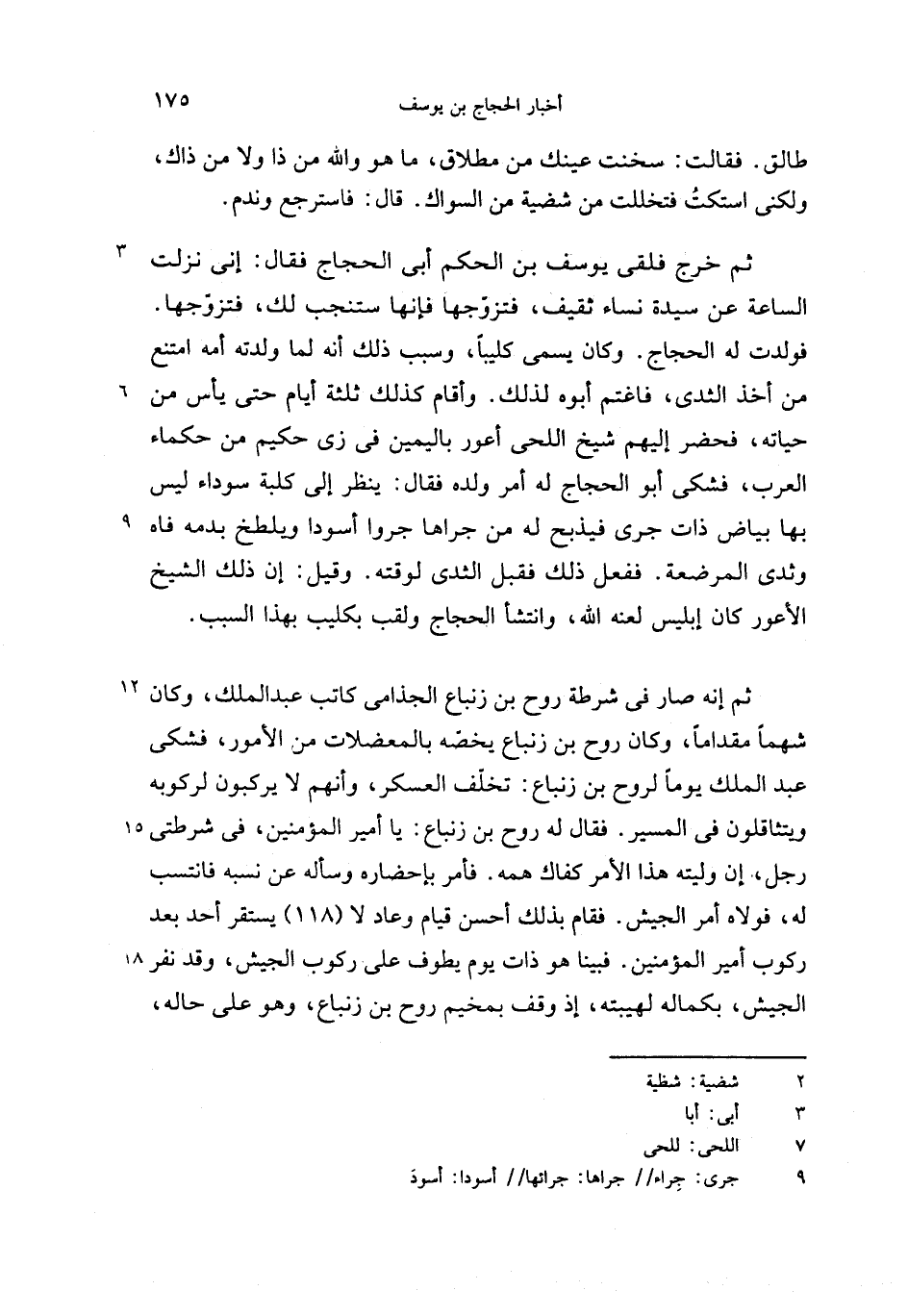 فولدت له الحجاج. وكان يسمى كليبا، وسبب ذلك أنه لما ولدته أمه امتنع من أخذ الثدى، فاغتم أبوه لذلك. وأقام كذلك ثلثة أيام حتى يأس من حياته، فحضر إليهم شيخ اللحى أعور باليمين فى زى حكيم من حكماء العرب، فشكى أبو الحجاج له أمر ولده فقال: ينظر إلى كلبة سوداء ليس بها بياض ذات جرى فيذبح له من جراها جروا أسودا ويلطخ بدمه فاه وثدى المرضعة. ففعل ذلك فقبل الثدى لوقته. وقيل: إن ذلك الشيخ الأعور كان إبليس لعنه الله، وانتشأ الحجاج ولقب بكليب بهذا السبب.