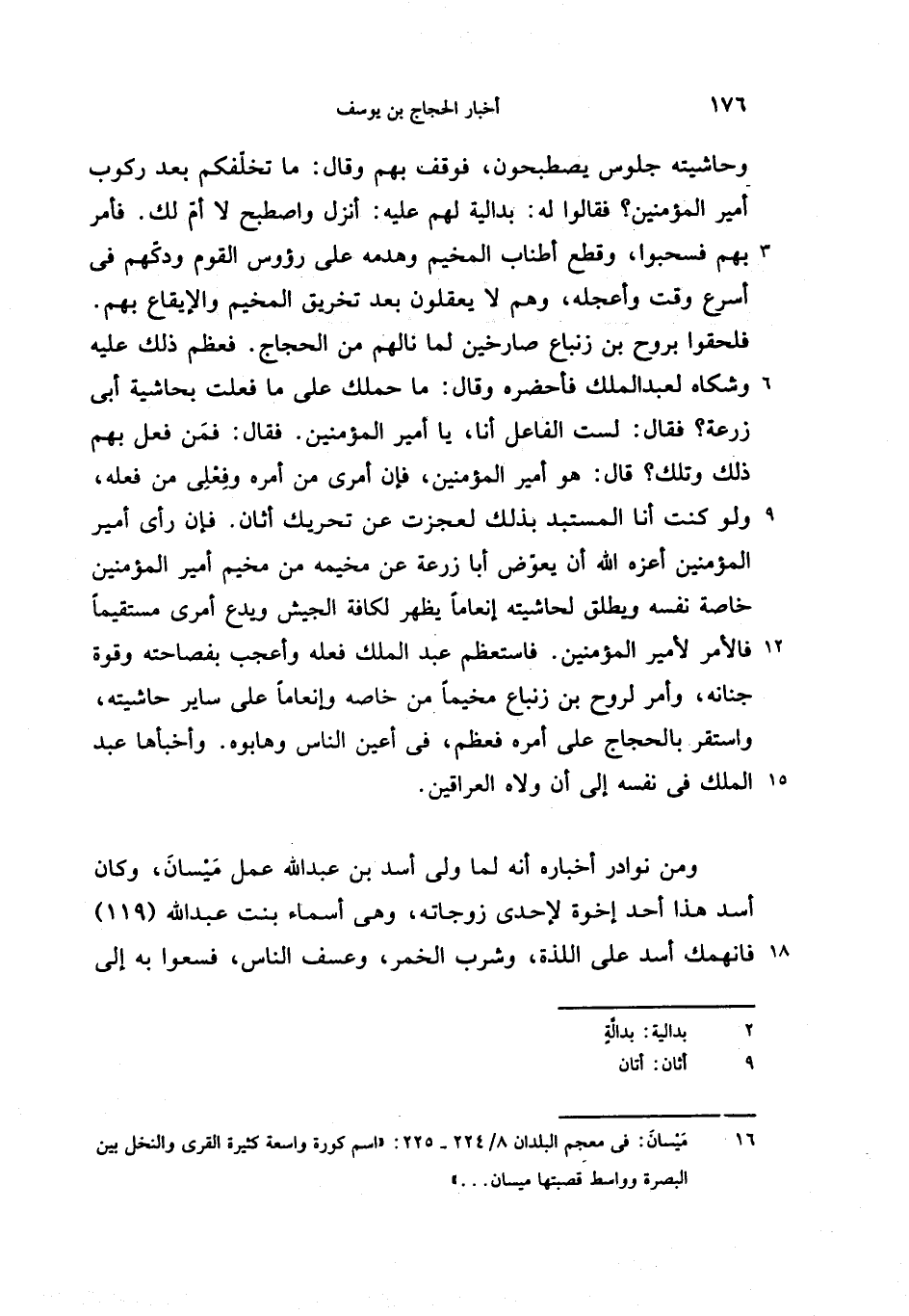 فلحقوا بروح بن زنباع صارخين لما نالهم من الحجاج. فعظم ذلك عليه وشكاه لعبد الملك فأحضره وقال: ما حملك على ما فعلت بحاشية أبى زرعة؟ فقال: لست الفاعل أنا، يا أمير المؤمنين. فقال: فمن فعل بهم ذلك وتلك؟ قال: هو أمير المؤمنين، فإن أمرى من أمره وفعلى من فعله، ولو كنت أنا المستبد بذلك لعجزت عن تحريك أثان. فإن رأى أمير المؤمنين أعزه الله أن يعوّض أبا زرعة عن مخيمه من مخيم أمير المؤمنين خاصة نفسه ويطلق لحاشيته إنعاما يظهر لكافة الجيش ويدع أمرى مستقيما فالأمر لأمير المؤمنين. فاستعظم عبد الملك فعله وأعجب بفصاحته وقوة جنانه، وأمر لروح بن زنباع مخيما من خاصه وإنعاما على ساير حاشيته، واستقر بالحجاج على أمره فعظم، فى أعين الناس وهابوه. وأخبأها عبد الملك فى نفسه إلى أن ولاه العراقين.