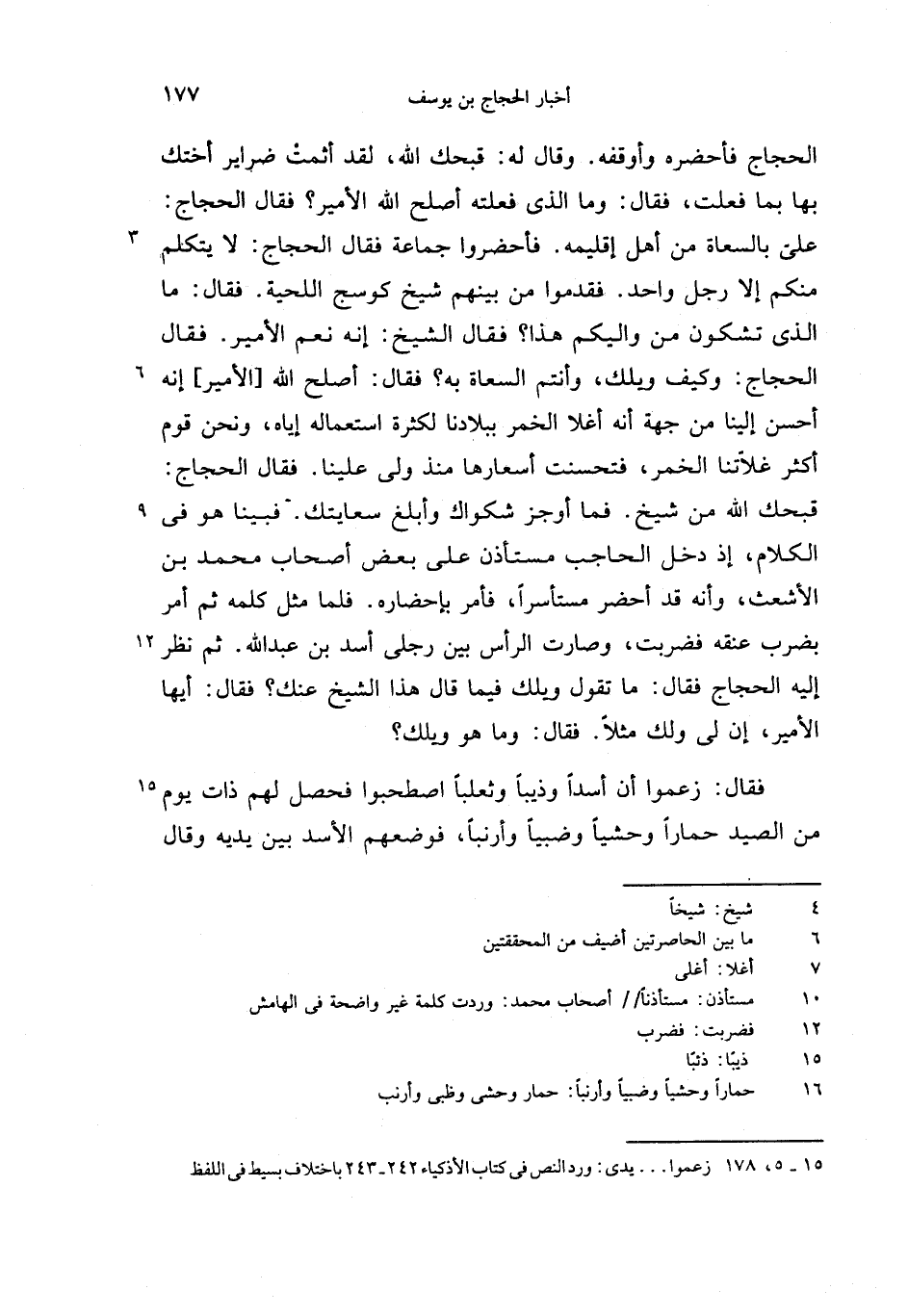 علىّ بالسعاة من أهل إقليمه. فأحضروا جماعة فقال الحجاج: لا يتكلم منكم إلا رجل واحد. فقدموا من بينهم شيخ كوسج اللحية. فقال: ما الذى تشكون من واليكم هذا؟ فقال الشيخ: إنه نعم الأمير. فقال الحجاج: وكيف ويلك، وأنتم السعاة به؟ فقال: أصلح الله [الأمير] إنه أحسن إلينا من جهة أنه أغلا الخمر ببلادنا لكثرة استعماله إياه، ونحن قوم أكثر غلاّتنا الخمر، فتحسنت أسعارها منذ ولى علينا. فقال الحجاج: