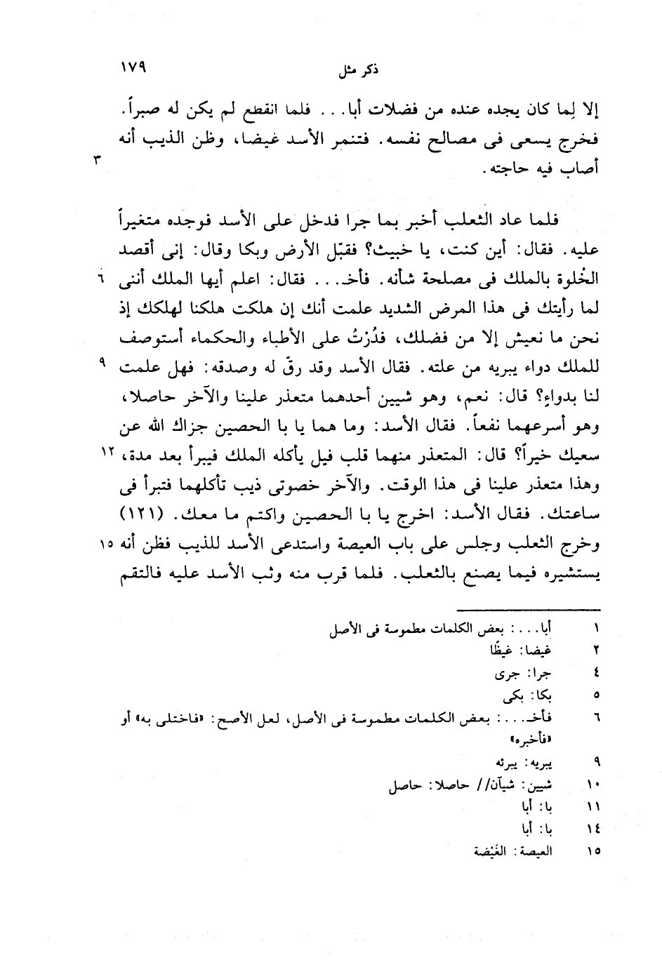 فلما عاد الثعلب أخبر بما جرا فدخل على الأسد فوجده متغيرا عليه. فقال: أين كنت، يا خبيث؟ فقبّل الأرض وبكا وقال: إنى أقصد الخلوة بالملك فى مصلحة شأنه. فأخ. . . فقال: اعلم أيها الملك أننى لما رأيتك فى هذا المرض الشديد علمت أنك إن هلكت هلكنا لهلكك إذ نحن ما نعيش إلا من فضلك، فدرت على الأطباء والحكماء أستوصف للملك دواء يبريه من علته. فقال الأسد وقد رقّ له وصدقه: فهل علمت لنا بدواء؟ قال: نعم، وهو شيين أحدهما متعذر علينا والآخر حاصلا، وهو أسرعهما نفعا. فقال الأسد: وما هما يا با الحصين جزاك الله عن سعيك خيرا؟ قال: المتعذر منهما قلب فيل يأكله الملك فيبرأ بعد مدة، وهذا متعذر علينا فى هذا الوقت. والآخر خصوتى ذيب تأكلهما فتبرأ فى ساعتك. فقال الأسد: اخرج يا با الحصين واكتم ما معك. (121) وخرج الثعلب وجلس على باب العيصة واستدعى الأسد للذيب فظن أنه يستشيره فيما يصنع بالثعلب. فلما قرب منه وثب الأسد عليه فالتقم