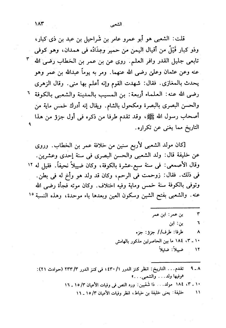 قلت: الشعبى هو أبو عمرو عامر بن شراحيل بن عبد بن ذى كبار، وذو كبار قيل من أقيال اليمن من حمير وعداده فى همدان، وهو كوفى تابعى جليل القدر وافر العلم. روى عن بن عمر بن الخطاب رضى الله عنه وعن عثمان وعلىّ رضى الله عنهما. ومر به يوما عبد الله بن عمر وهو يحدث بالمغازى. فقال: شهدت القوم وإنه أعلم بها منى. وقال الزهرى رضى الله عنه: العلماء أربعة: بن المسيب بالمدينة والشعبى بالكوفة والحسن البصرى بالبصرة ومكحول بالشام. ويقال إنه أدرك خمس ماية من أصحاب رسول الله صلّى الله عليه وسلّم، وقد تقدم طرفا من ذكره فى أول جزؤ من هذا التاريخ مما يغنى عن تكراره.