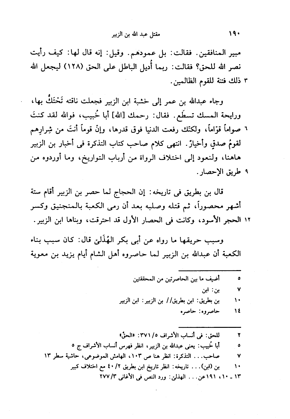 وجاء عبد الله بن عمر إلى خشبة ابن الزبير فجعلت ناقته تحتكّ بها، ورايحة المسك تسطع. فقال: رحمك [الله] أبا خبيب، فو الله لقد كنت صواما قوّاما، ولكنّك رفعت الدنيا فوق قدرها، وإنّ قوما أنت من شرارهم لقوم صدق وأخيار. انتهى كلام صاحب كتاب التذكرة فى أخبار بن الزبير ها هنا، ولنعود إلى اختلاف الرواة من أرباب التواريخ، وما أوردوه من طريق الإحصار.