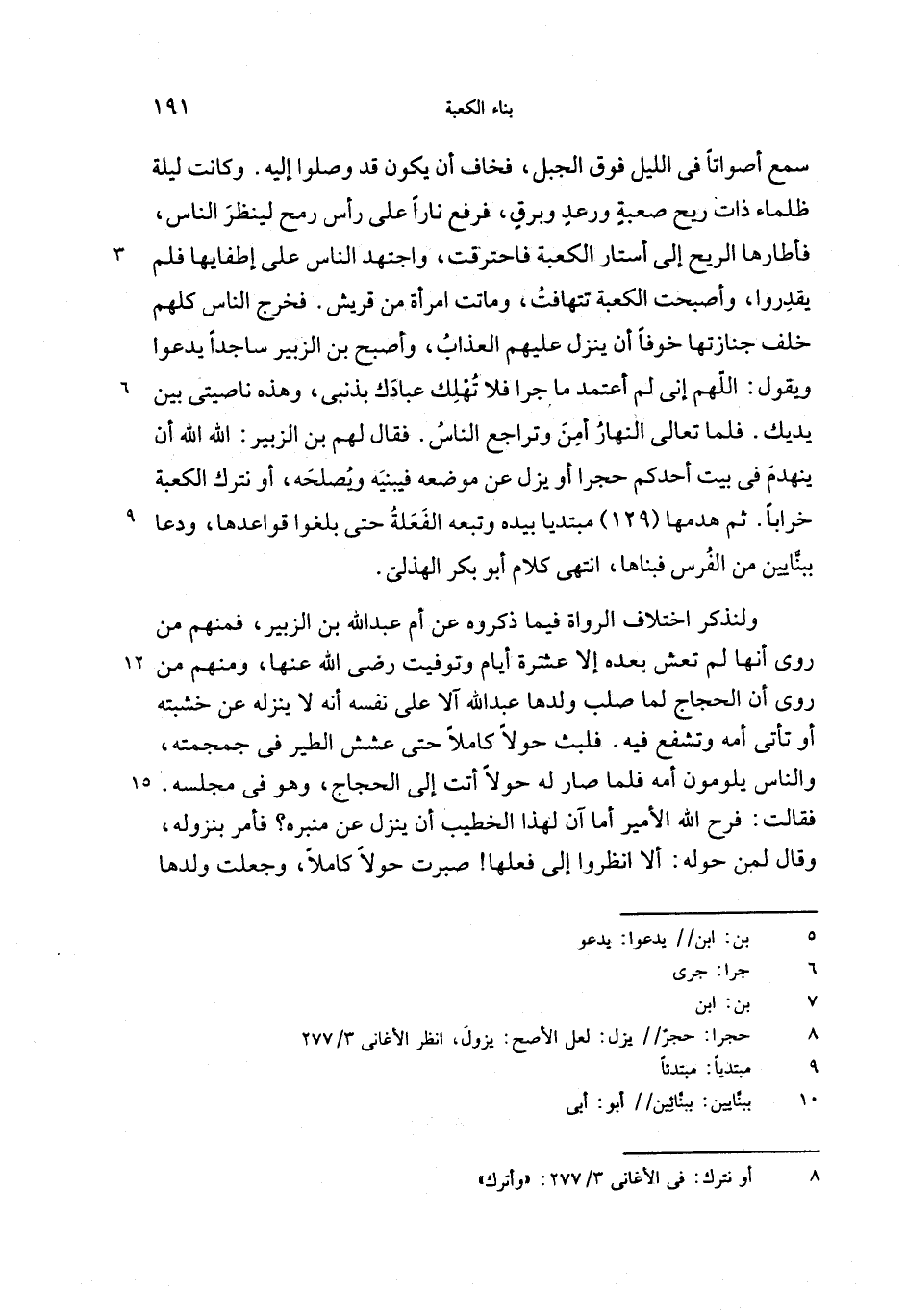سمع أصواتا فى الليل فوق الجبل، فخاف أن يكون قد وصلوا إليه. وكانت ليلة ظلماء ذات ريح صعبة ورعد وبرق، فرفع نارا على رأس رمح لينظر الناس، فأطارها الريح إلى أستار الكعبة فاحترقت، واجتهد الناس على إطفايها فلم يقدروا، وأصبحت الكعبة تتهافت، وماتت امرأة من قريش. فخرج الناس كلهم خلف جنازتها خوفا أن ينزل عليهم العذاب، وأصبح بن الزبير ساجدا يدعوا ويقول: اللهم إنى لم أعتمد ما جرا فلا تهلك عبادك بذنبى، وهذه ناصيتى بين يديك. فلما تعالى النهار أمن وتراجع الناس. فقال لهم بن الزبير: الله الله أن ينهدم فى بيت أحدكم حجرا أو يزل عن موضعه فيبنيه ويصلحه، أو نترك الكعبة خرابا. ثم هدمها (129) مبتديا بيده وتبعه الفعلة حتى بلغوا قواعدها، ودعا ببنّايين من الفرس فبناها، انتهى كلام أبو بكر الهذلىّ.