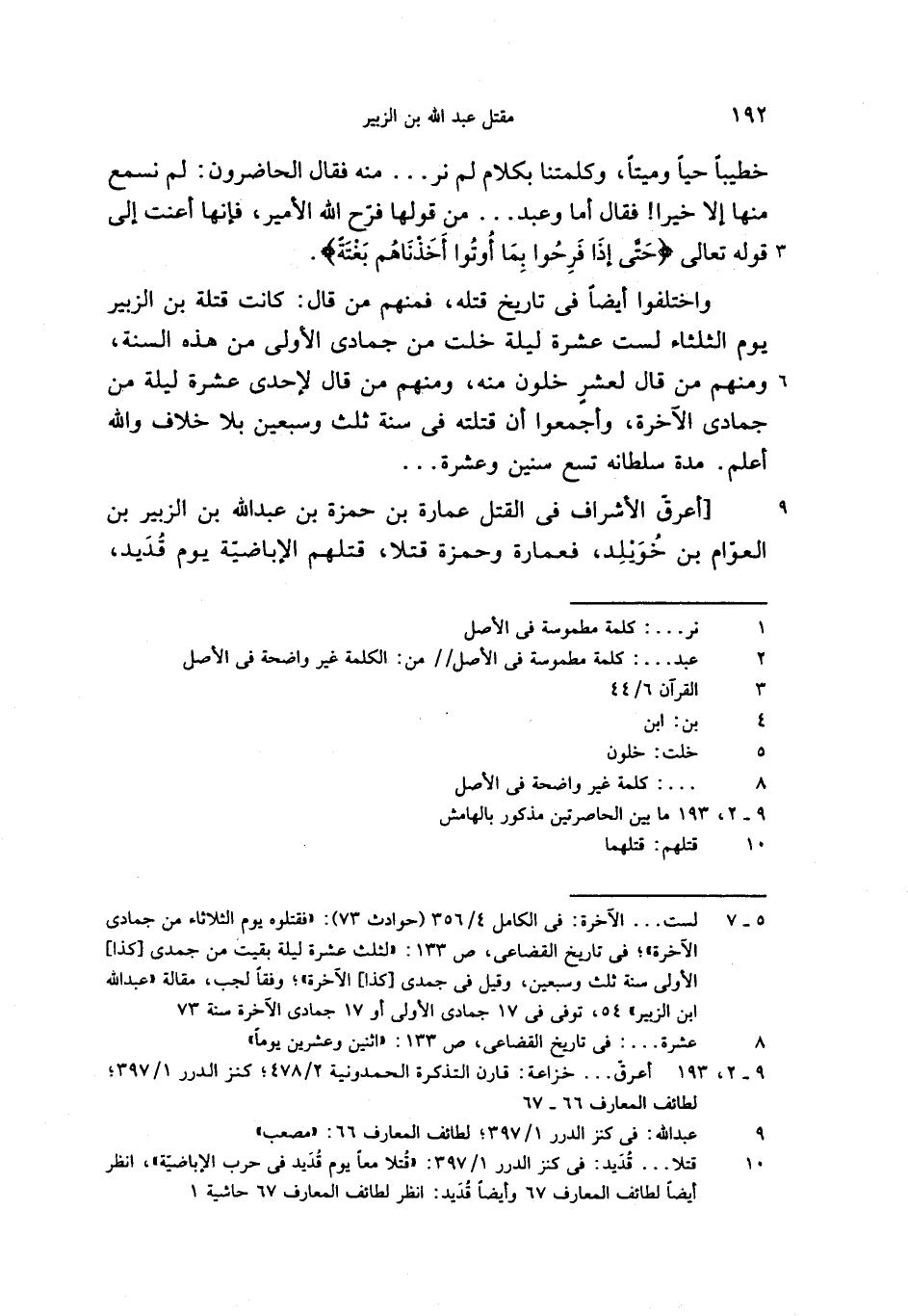 (5 - 7) لست. . . الآخرة: فى الكامل 4/ 356 (حوادث 73): «فقتلوه يوم الثلاثاء من جمادى الآخرة»؛ فى تاريخ القضاعى، ص 133: «لثلث عشرة ليلة بقيت من جمدى [كذا] الأولى سنة ثلث وسبعين، وقيل فى جمدى [كذا] الآخرة»؛ وفقا لجب، مقالة «عبد الله ابن الزبير» 54، توفى فى 17 جمادى الأولى أو 17 جمادى الآخرة سنة 73
