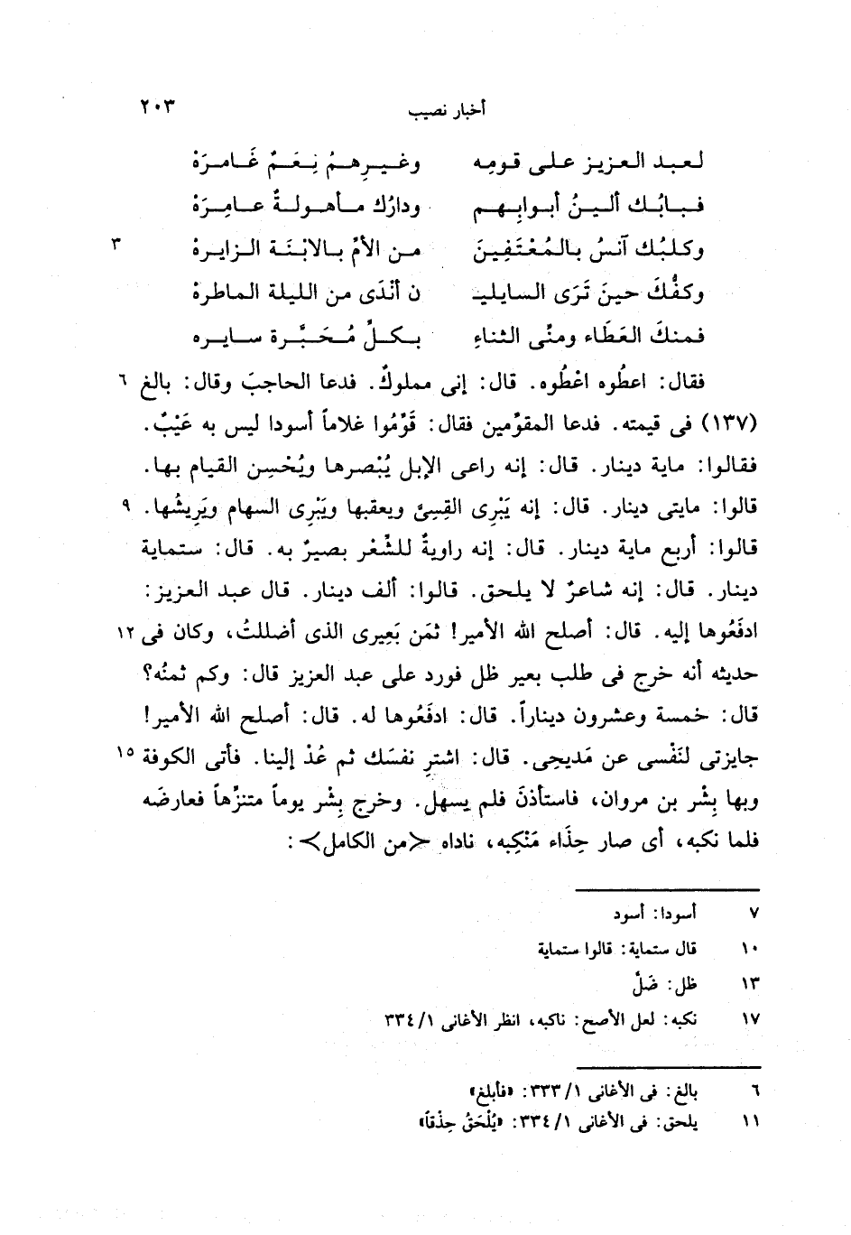 ادفعوها إليه. قال: أصلح الله الأمير! ثمن بعيرى الذى أضللت، وكان فى حديثه أنه خرج فى طلب بعير ظل فورد على عبد العزيز قال: وكم ثمنه؟ قال: خمسة وعشرون دينارا. قال: ادفعوها له. قال: أصلح الله الأمير! جايزتى لنفسى عن مديحى. قال: اشتر نفسك ثم عد إلينا. فأتى الكوفة وبها بشر بن مروان، فاستأذن فلم يسهل. وخرج بشر يوما متنزّها فعارضه فلما نكبه، أى صار حذاء منكبه، ناداه <من الكامل>: