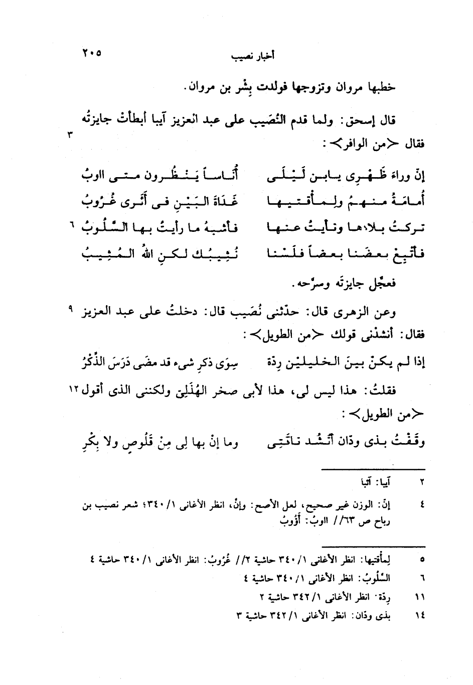وعن الزهرى قال: حدّثنى نصيب قال: دخلت على عبد العزيز فقال: أنشدنى قولك <من الطويل>: