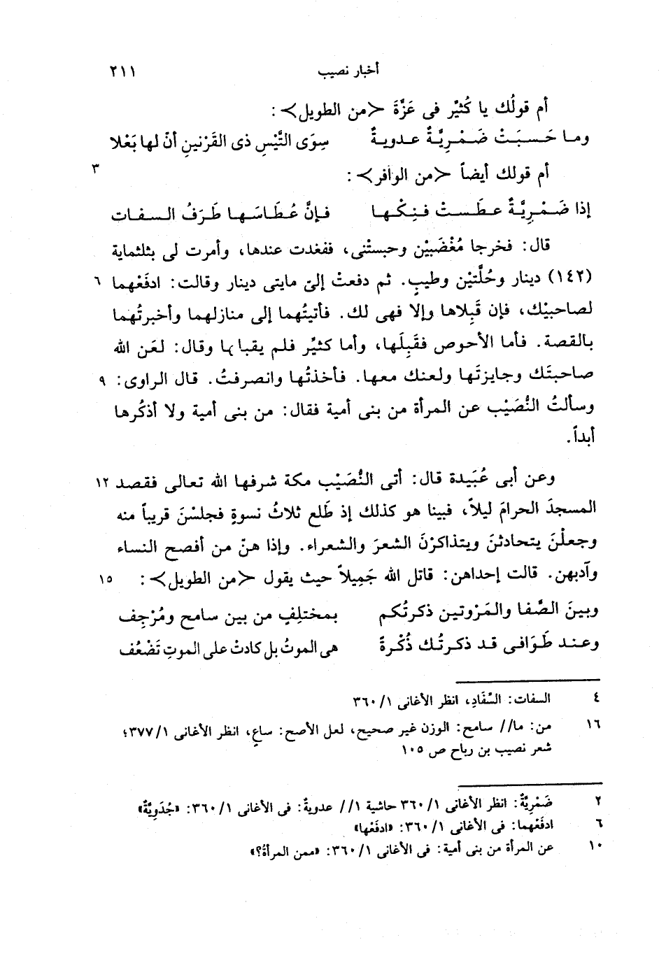 وعن أبى عبيدة قال: أتى النّصيب مكة شرفها الله تعالى فقصد المسجد الحرام ليلا، فبينا هو كذلك إذ طلع ثلاث نسوة فجلسن قريبا منه وجعلن يتحادثن ويتذاكرن الشعر والشعراء. وإذا هنّ من أفصح النساء وآدبهن. قالت إحداهن: قاتل الله جميلا حيث يقول <من الطويل>: