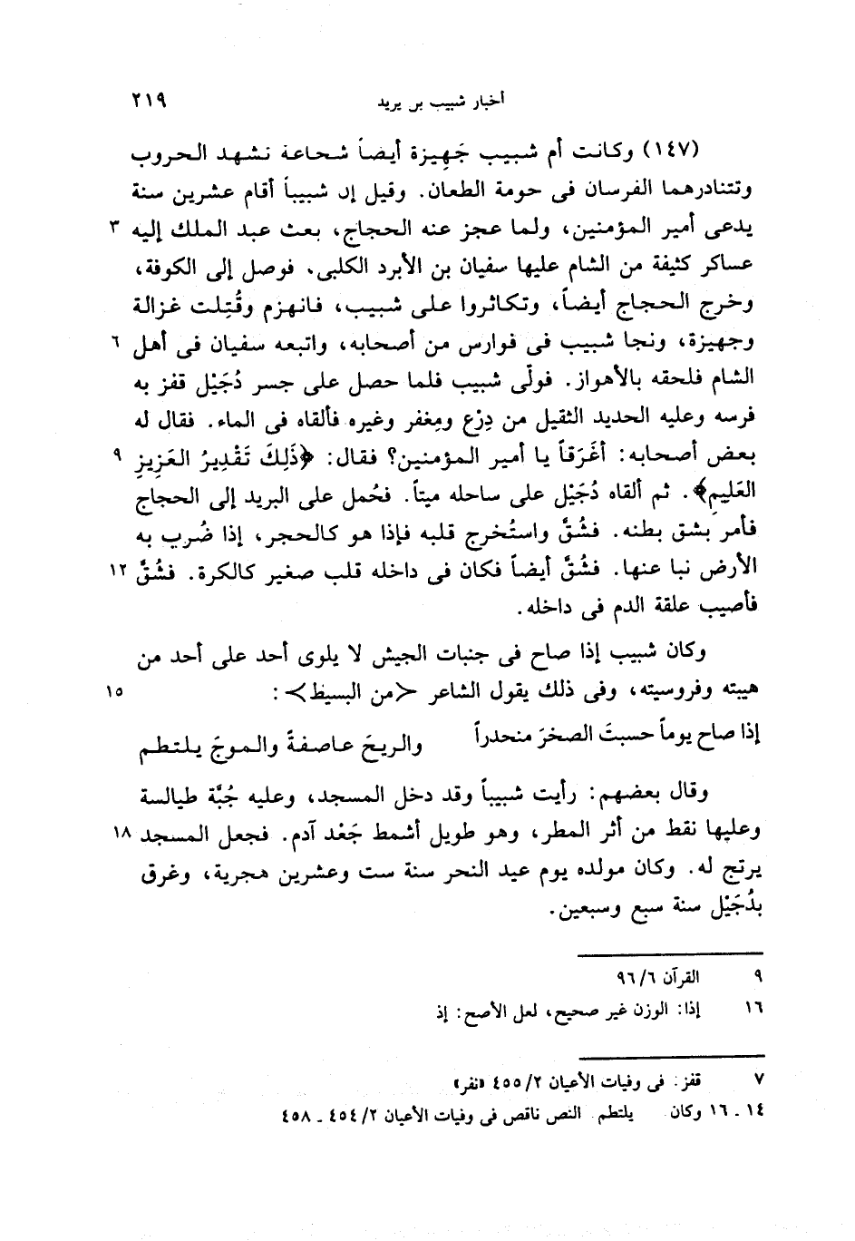 (147) وكانت أم شبيب جهيزة أيضا شجاعة تشهد الحروب وتتنادرهما الفرسان فى حومة الطعان. وقيل إن شبيبا أقام عشرين سنة يدعى أمير المؤمنين، ولما عجز عنه الحجاج، بعث عبد الملك إليه عساكر كثيفة من الشام عليها سفيان بن الأبرد الكلبى، فوصل إلى الكوفة، وخرج الحجاج أيضا، وتكاثروا على شبيب، فانهزم وقتلت غزالة وجهيزة، ونجا شبيب فى فوارس من أصحابه، واتبعه سفيان فى أهل الشام فلحقه بالأهواز. فولّى شبيب فلما حصل على جسر دجيل قفز به فرسه وعليه الحديد الثقيل من درع ومغفر وغيره فألقاه فى الماء. فقال له بعض أصحابه: أغرقا يا أمير المؤمنين؟ فقال: {ذلِكَ تَقْدِيرُ الْعَزِيزِ الْعَلِيمِ}. ثم ألقاه دجيل على ساحله ميتا. فحمل على البريد إلى الحجاج فأمر بشق بطنه. فشقّ واستخرج قلبه فإذا هو كالحجر، إذا ضرب به الأرض نبا عنها. فشقّ أيضا فكان فى داخله قلب صغير كالكرة. فشقّ فأصيب علقة الدم فى داخله.
