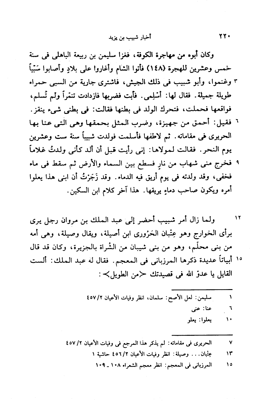 ولما زال أمر شبيب أحضر إلى عبد الملك بن مروان رجل يرى برأى الخوارج وهو عتبان الحرورى ابن أصيلة، ويقال وصيلة، وهى أمه من بنى محلّم، وهو من بنى شيبان من الشراة بالجزيرة، وكان قد قال أبياتا عديدة ذكرها المرزبانى فى المعجم. فقال له عبد الملك: ألست القايل يا عدوّ الله فى قصيدتك <من الطويل>: