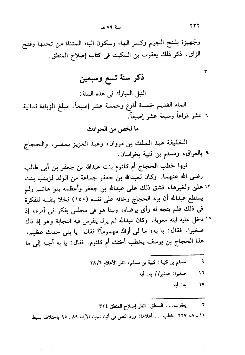 فيها خطب الحجاج أم كلثوم بنت عبد الله بن جعفر بن أبى طالب رضى الله عنهما. وكان لعبد الله بن جعفر جماعة من الولد لزينب بنت علىّ ولغيرها، فشق ذلك على عبد الله بن جعفر وأعظمه بنو هاشم ولم يستطع عبد الله أن يرد الحجاج وخافه على نفسه (150) فخلا بنفسه للفكرة فى ذلك فلم يتجه له رأى يرضاه، وبينا هو فى مجلس يفكر فى أمره، إذ دخل عليه ابنه معوية، وكان عبد الله لم يزل يتفرس فيه النجابة وهو إذ ذاك صغيرا. فقال: يا به، ما لى أراك مهموما؟ فقال: يا بنى حدث عظيم، هذا الحجاج بن يوسف يخطب أختك أم كلثوم. فقال: يا به أجبه إلى ما