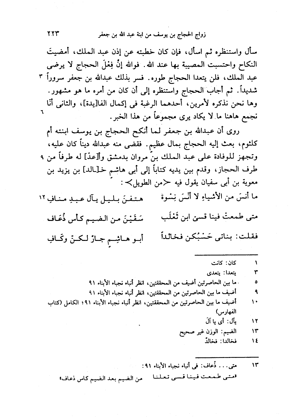 روى أن عبد الله بن جعفر لما أنكح الحجاج بن يوسف ابنته أم كلثوم، بعث إليه الحجاج بمال عظيم. فقضى منه عبد الله دينا كان عليه، وتجهز للوفادة على عبد الملك بن مروان بدمشق وأ [عدّ] له طرفا من طرف الحجاز، وقدم بين يديه كتابا إلى أبى هاشم خ [الد] بن يزيد بن معوية بن أبى سفيان يقول فيه <من الطويل>: