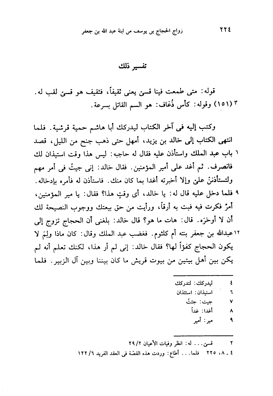 فلما دخل عليه قال له: يا خالد، أى وقت هذا؟ فقال: يا مير المؤمنين، أمر فكرت فيه فبت به أرقا، ورأيت من حق بيعتك ووجوب النصيحة لك أن لا أوخره. قال: هات ما هو؟ قال خالد: بلغنى أن الحجاج تزوج إلى عبد الله بن جعفر بنته أم كلثوم. فغضب عبد الملك وقال: كان ماذا ولم لا يكون الحجاج كفؤا لها؟ فقال خالد: إنى لم أر هذا، لكنك تعلم أنه لم يكن بين أهل بيتين من بيوت قريش ما كان بيننا وبين آل الزبير. فلما