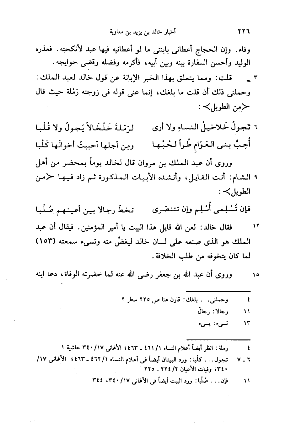 وروى أن عبد الملك بن مروان قال لخالد يوما بمحضر من أهل الشام: أنت القايل، وأنشده الأبيات المذكورة ثم زاد فيها <من الطويل>: