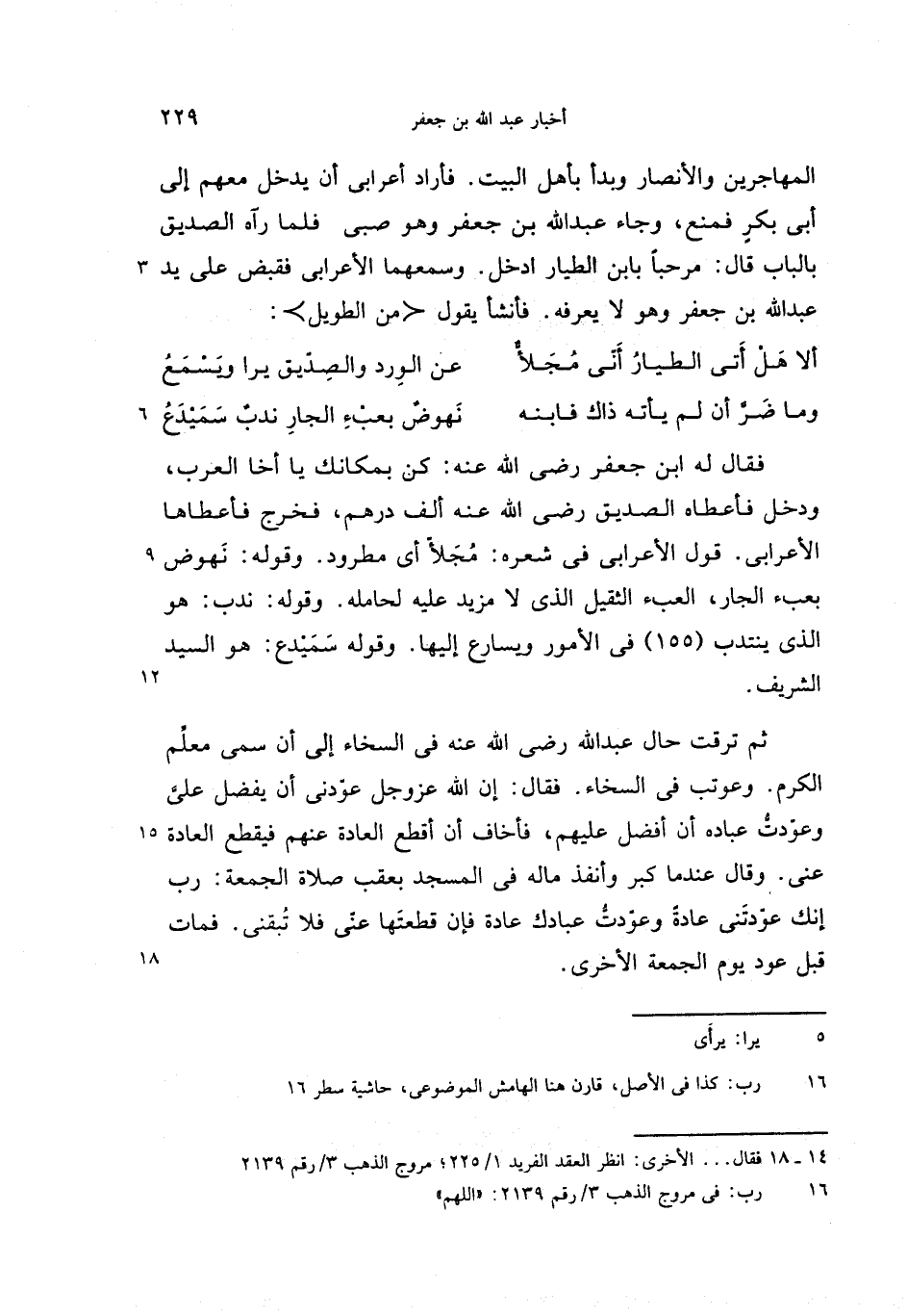فقال له ابن جعفر رضى الله عنه: كن بمكانك يا أخا العرب، ودخل فأعطاه الصديق رضى الله عنه ألف درهم، فخرج فأعطاها الأعرابى. قول الأعرابى فى شعره: مجلأّ أى مطرود. وقوله: نهوض بعبء الجار، العبء الثقيل الذى لا مزيد عليه لحامله. وقوله: ندب: هو الذى ينتدب (155) فى الأمور ويسارع إليها. وقوله سميدع: هو السيد الشريف.