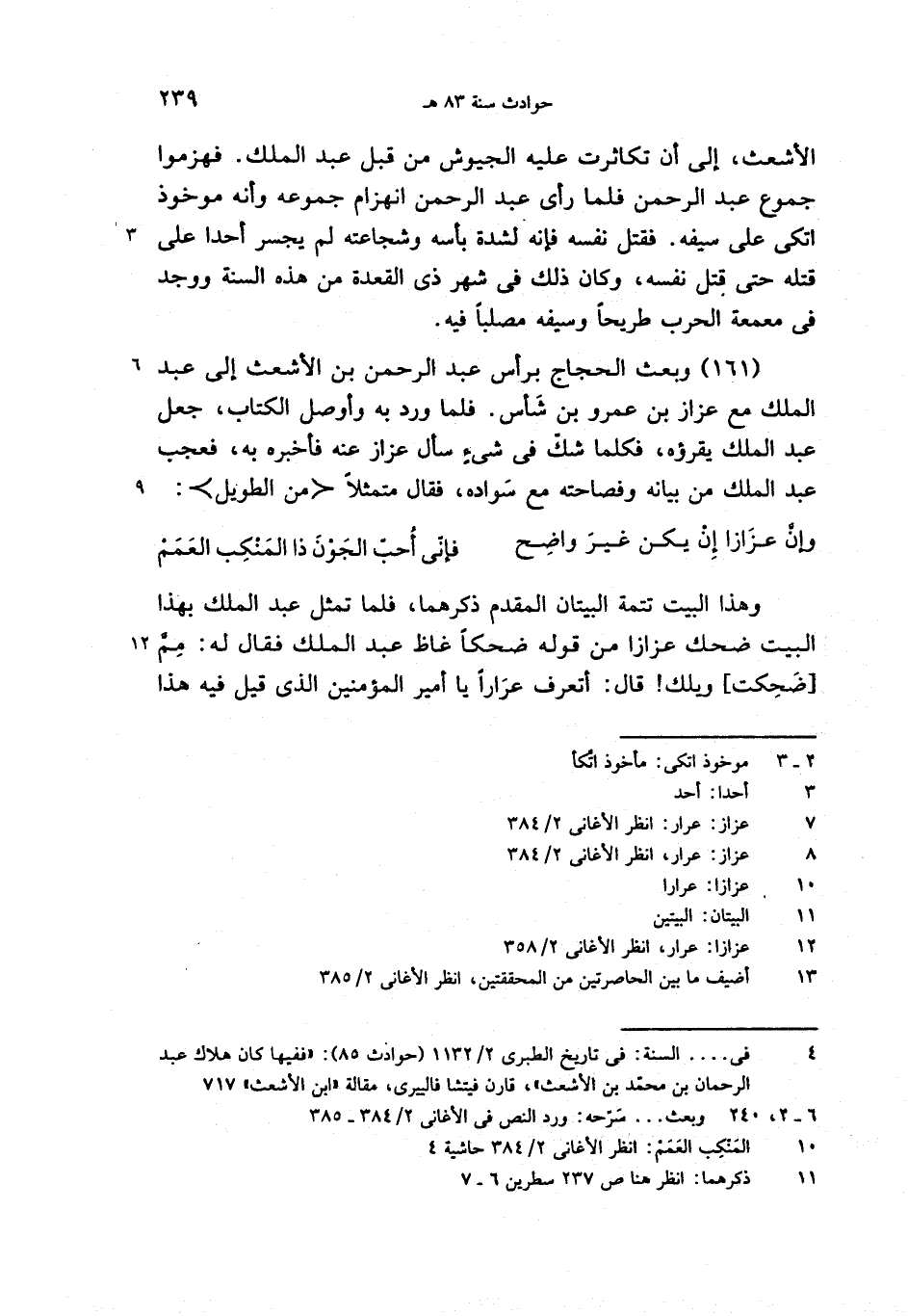 (161) وبعث الحجاج برأس عبد الرحمن بن الأشعث إلى عبد الملك مع عزاز بن عمرو بن شأس. فلما ورد به وأوصل الكتاب، جعل عبد الملك يقرؤه، فكلما شكّ فى شئ سأل عزاز عنه فأخبره به، فعجب عبد الملك من بيانه وفصاحته مع سواده، فقال متمثلا <من الطويل>: