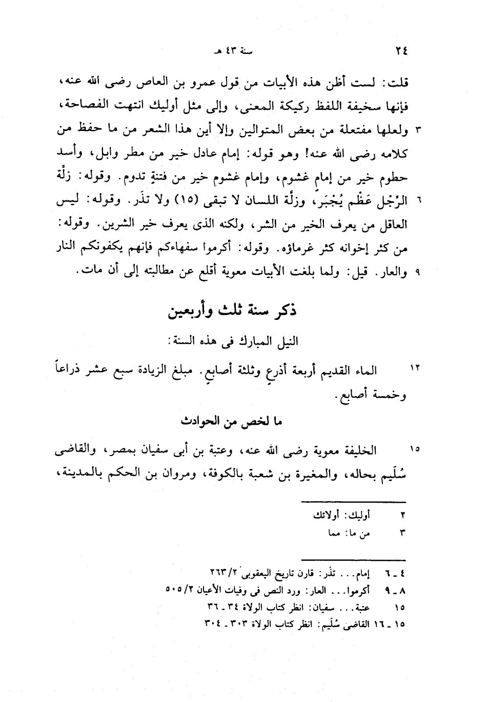 قلت: لست أظن هذه الأبيات من قول عمرو بن العاص رضى الله عنه، فإنها سخيفة اللفظ ركيكة المعنى، وإلى مثل أوليك انتهت الفصاحة، ولعلها مفتعلة من بعض المتوالين وإلا أين هذا الشعر من ما حفظ من كلامه رضى الله عنه! وهو قوله: إمام عادل خير من مطر وابل، وأسد حطوم خير من إمام غشوم، وإمام غشوم خير من فتنة تدوم. وقوله: زلّة الرّجل عظم يجبر، وزلّة اللسان لا تبقى (15) ولا تذر. وقوله: ليس العاقل من يعرف الخير من الشر، ولكنه الذى يعرف خير الشرين. وقوله: