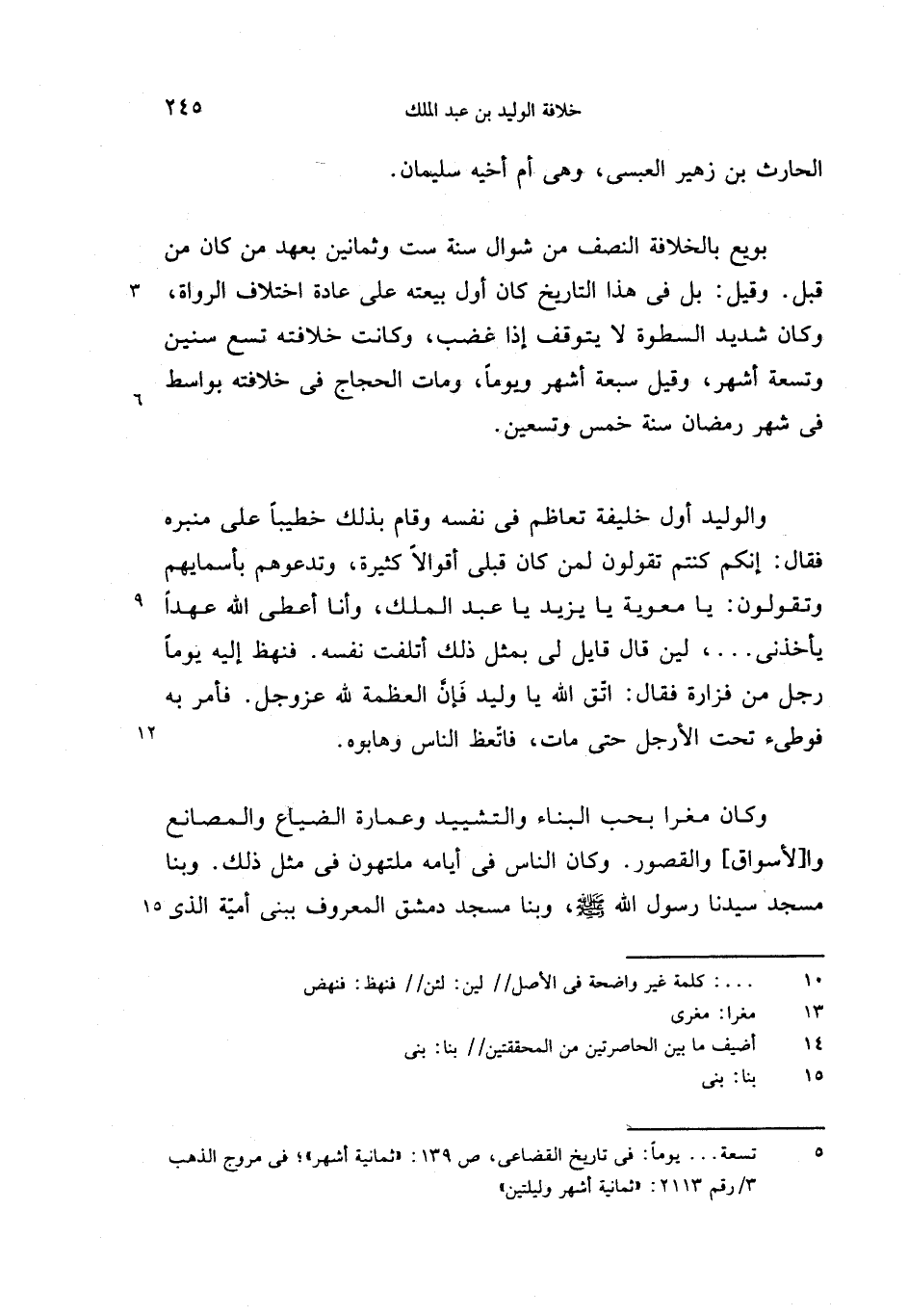 وكان مغرا بحب البناء والتشييد وعمارة الضياع والمصانع وا [لأسواق] والقصور. وكان الناس فى أيامه ملتهون فى مثل ذلك. وبنا مسجد سيدنا رسول الله صلّى الله عليه وسلّم، وبنا مسجد دمشق المعروف ببنى أميّة الذى