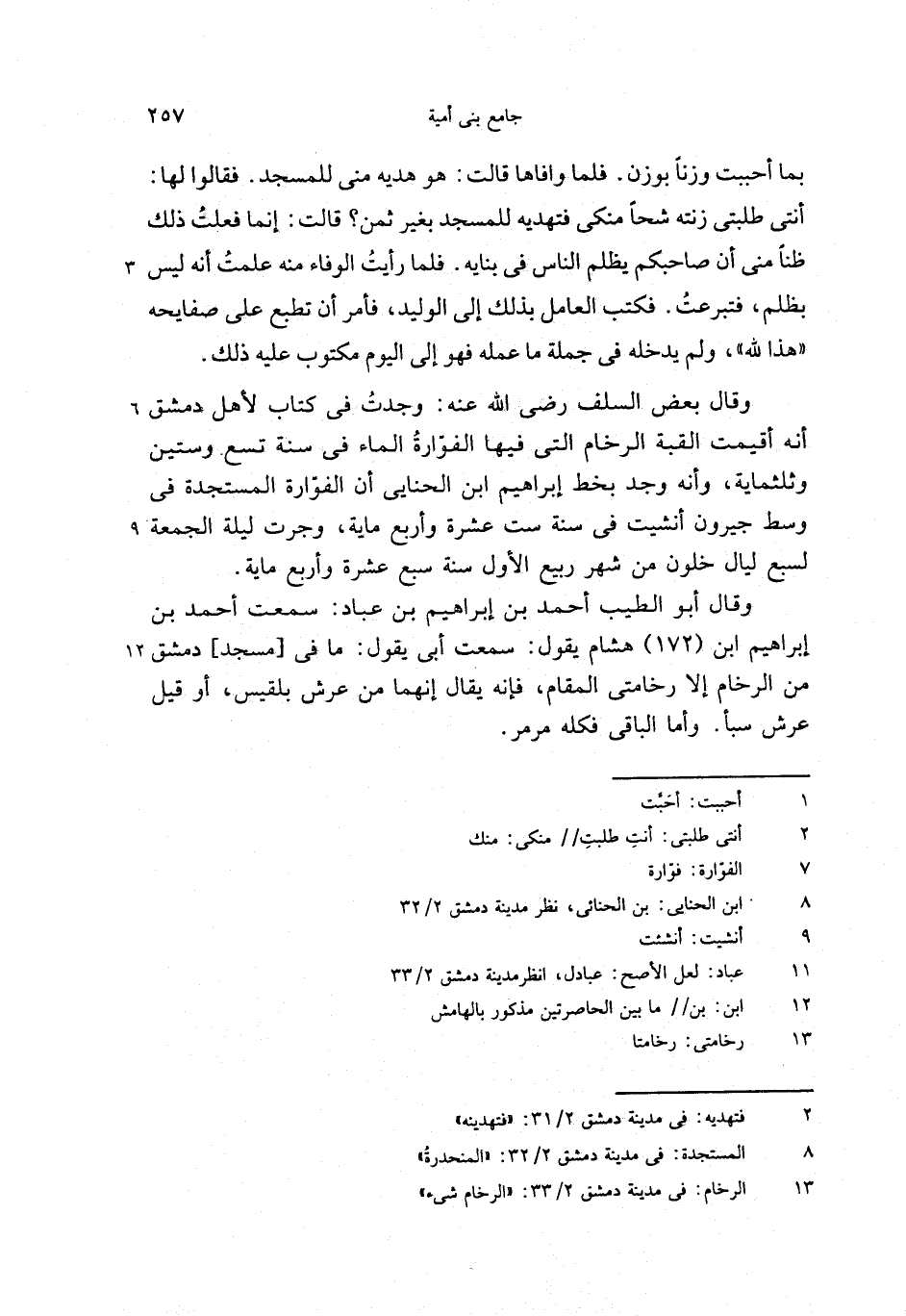 وقال أبو الطيب أحمد بن إبراهيم بن عباد: سمعت أحمد بن إبراهيم ابن (172) هشام يقول: سمعت أبى يقول: ما فى [مسجد] دمشق من الرخام إلا رخامتى المقام، فإنه يقال إنهما من عرش بلقيس، أو قيل عرش سبأ. وأما الباقى فكله مرمر.