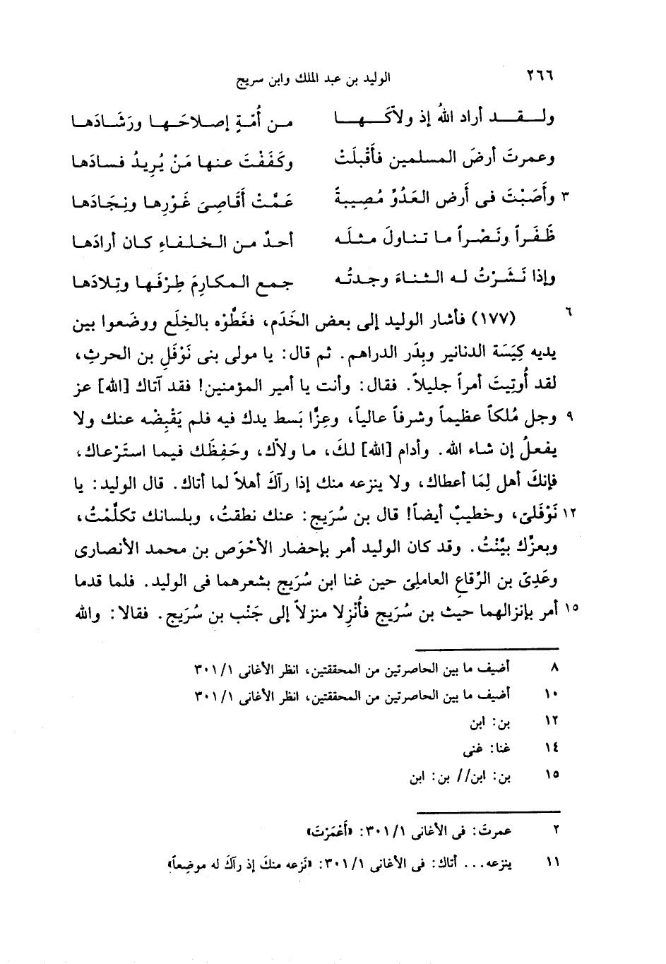 (177) فأشار الوليد إلى بعض الخدم، فغطّوه بالخلع ووضعوا بين يديه كيسة الدنانير وبدر الدراهم. ثم قال: يا مولى بنى نوفل بن الحرث، لقد أوتيت أمرا جليلا. فقال: وأنت يا أمير المؤمنين! فقد آتاك [الله] عز وجل ملكا عظيما وشرفا عاليا، وعزّا بسط يدك فيه فلم يقبضه عنك ولا يفعل إن شاء الله. وأدام [الله] لك، ما ولاّك، وحفظك فيما استرعاك، فإنك أهل لما أعطاك، ولا ينزعه منك إذا رآك أهلا لما أتاك. قال الوليد: يا نوفلىّ، وخطيب أيضا! قال بن سريج: عنك نطقت، وبلسانك تكلّمت، وبعزّك بيّنت. وقد كان الوليد أمر بإحضار الأحوص بن محمد الأنصارى وعدىّ بن الرّقاع العاملىّ حين غنا ابن سريج بشعرهما فى الوليد. فلما قدما أمر بإنزالهما حيث بن سريج فأنزلا منزلا إلى جنب بن سريج. فقالا: والله