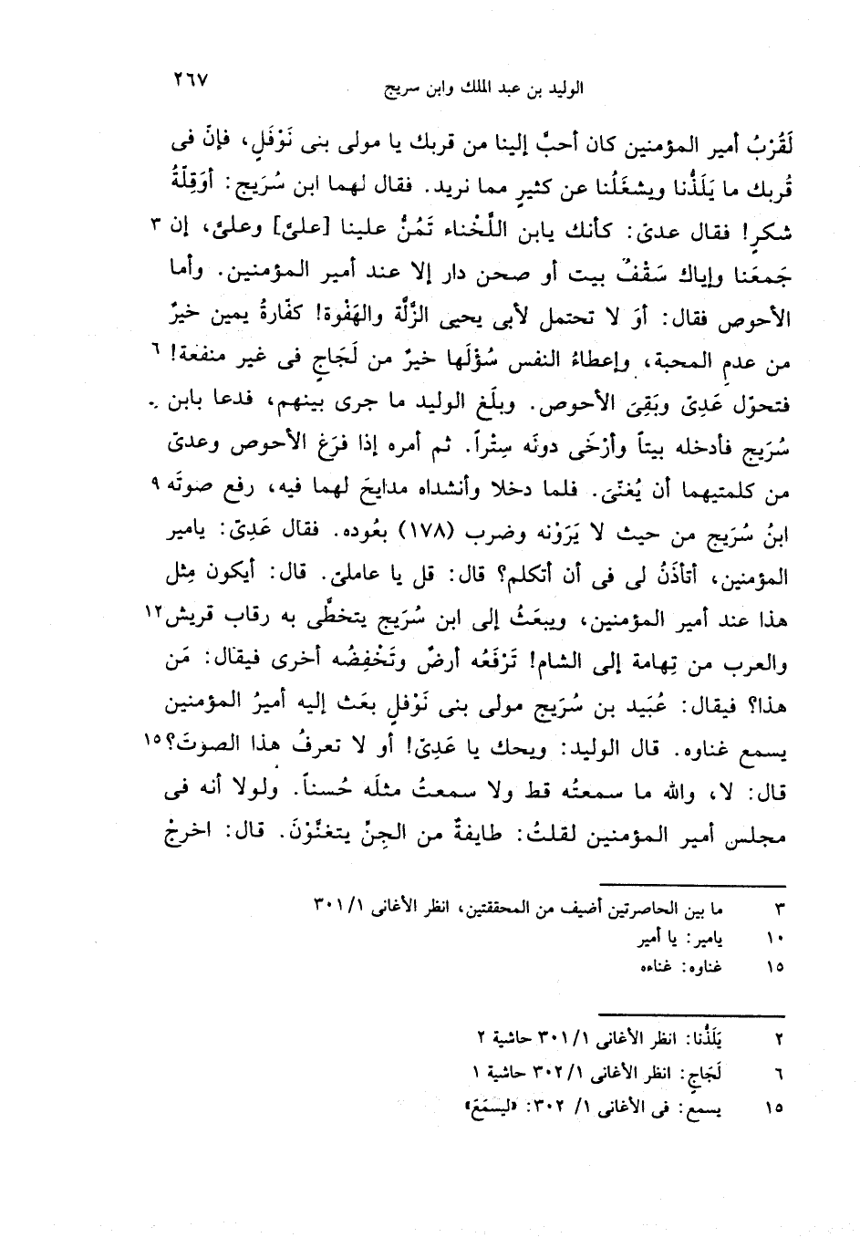 لقرب أمير المؤمنين كان أحبّ إلينا من قربك يا مولى بنى نوفل، فإنّ فى قربك ما يلذّنا ويشغلنا عن كثير مما نريد. فقال لهما ابن سريج: أوقلّة شكر! فقال عدىّ: كأنك يابن اللّخناء تمنّ علينا [علىّ] وعلىّ، إن جمعنا وإياك سقف بيت أو صحن دار إلا عند أمير المؤمنين. وأما الأحوص فقال: أو لا تحتمل لأبى يحيى الزّلّة والهفوة! كفّارة يمين خير من عدم المحبة، وإعطاء النفس سؤلها خير من لجاج فى غير منفعة! فتحوّل عدىّ وبقى الأحوص. وبلغ الوليد ما جرى بينهم، فدعا بابن سريج فأدخله بيتا وأرخى دونه سترا. ثم أمره إذا فرغ الأحوص وعدىّ من كلمتيهما أن يغنّى. فلما دخلا وأنشداه مدايح لهما فيه، رفع صوته ابن سريج من حيث لا يرونه وضرب (178) بعوده. فقال عدىّ: يامير المؤمنين، أتأذن لى فى أن أتكلم؟ قال: قل يا عاملىّ. قال: أيكون مثل هذا عند أمير المؤمنين، ويبعث إلى ابن سريج يتخطّى به رقاب قريش والعرب من تهامة إلى الشام! ترفعه أرض وتخفضه أخرى فيقال: من هذا؟ فيقال: عبيد بن سريج مولى بنى نوفل بعث إليه أمير المؤمنين يسمع غناوه. قال الوليد: ويحك يا عدىّ! أو لا تعرف هذا الصوت؟ قال: لا، والله ما سمعته قط ولا سمعت مثله حسنا. ولولا أنه فى مجلس أمير المؤمنين لقلت: طايفة من الجنّ يتغنّون. قال: اخرج