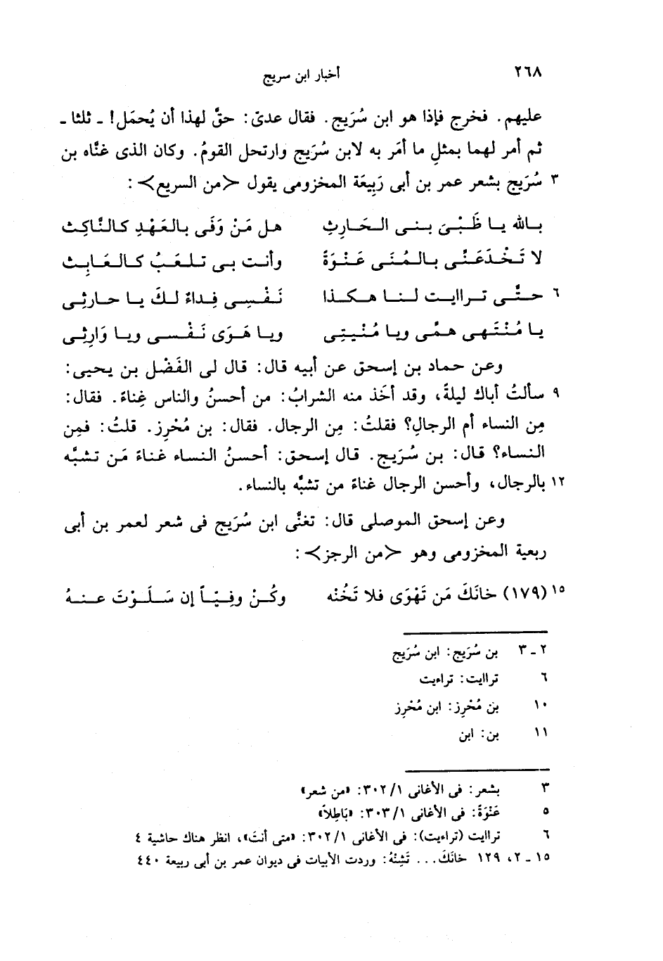 وعن إسحق الموصلى قال: تغنّى ابن سريج فى شعر لعمر بن أبى ربعية المخزومى وهو <من الرجز>: