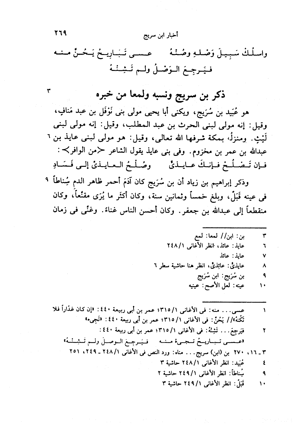 (3 - 16،270) بن (ابن) سريج. . . مناه: ورد النص فى الأغانى 1/ 248 - 249،251