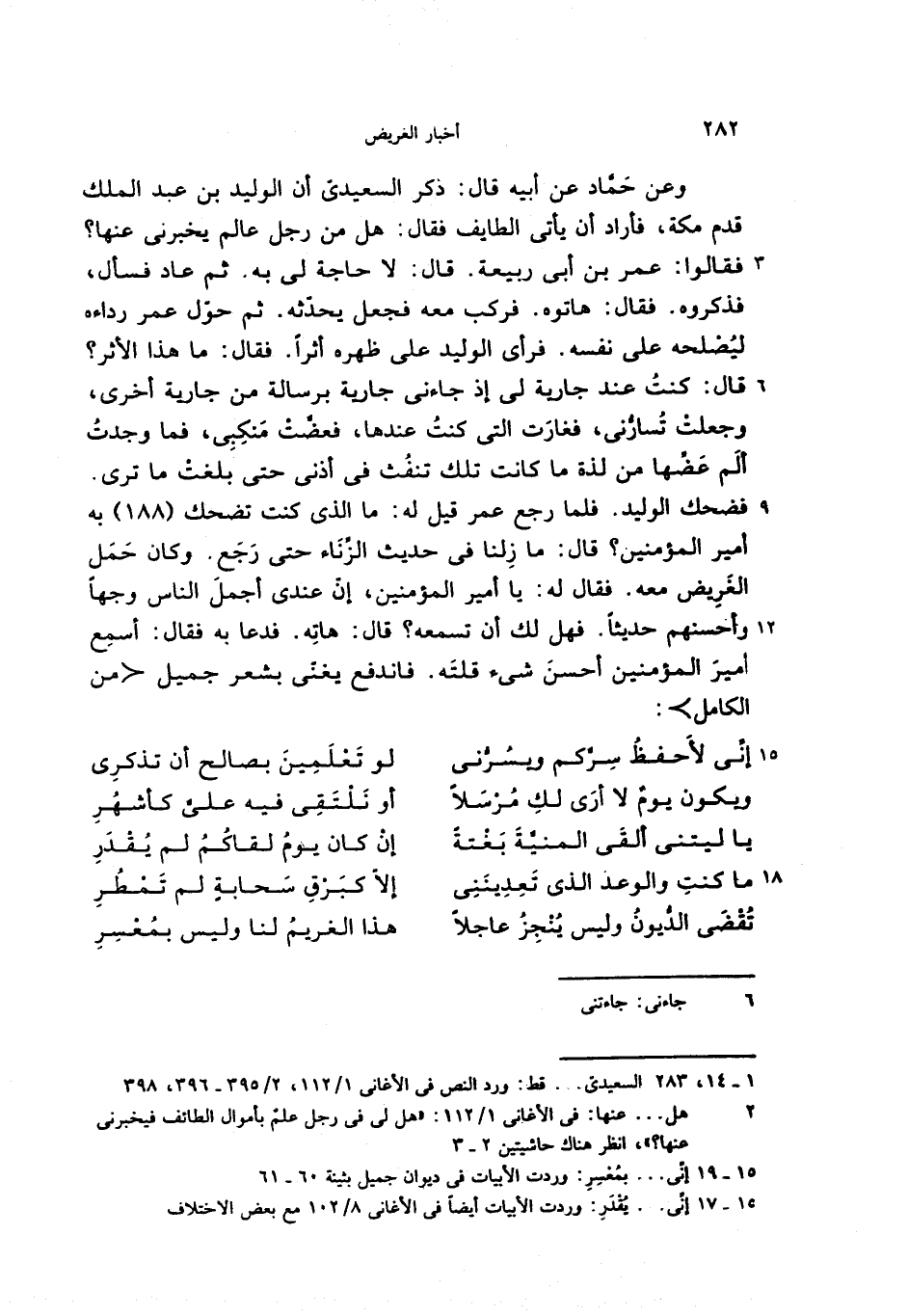 فضحك الوليد. فلما رجع عمر قيل له: ما الذى كنت تضحك (188) به أمير المؤمنين؟ قال: ما زلنا فى حديث الزّناء حتى رجع. وكان حمل الغريض معه. فقال له: يا أمير المؤمنين، إنّ عندى أجمل الناس وجها وأحسنهم حديثا. فهل لك أن تسمعه؟ قال: هاته. فدعا به فقال: أسمع أمير المؤمنين أحسن شئ قلته. فاندفع يغنّى بشعر جميل <من الكامل>: