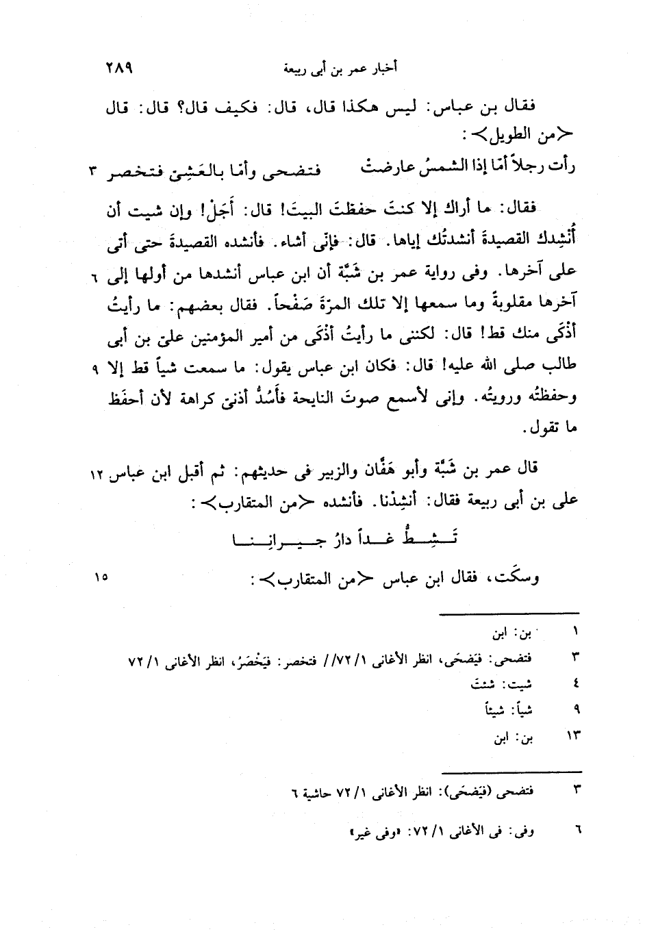 قال عمر بن شبّة وأبو هفّان والزبير فى حديثهم: ثم أقبل ابن عباس على بن أبى ربيعة فقال: أنشدنا. فأنشده <من المتقارب>:
