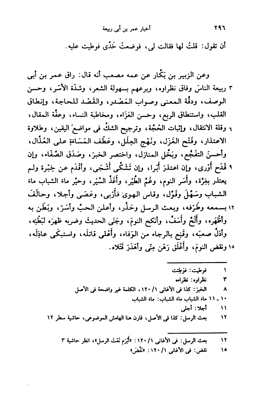 وعن الزبير بن بكّار عن عمه مصعب أنه قال: راق عمر بن أبى ربيعة الناس وفاق نظراوه، وبرعهم بسهولة الشعر، وشدّة الأسر، وحسن الوصف، ودقّة المعنى وصواب المصدر، والقصد للحاجة، وإنطاق القلب، واستنطاق الربع، وحسن العزاء، ومخاطبة النساء، وعفّة المقال، وقلة الانتقال، وإثبات الحجّة، وترجيح الشكّ فى مواضع اليقين، وطلاوة الاعتذار، وفتح الغزل، ونهج العلل، وعطف المساءة على العذّال، وأحسن التفجّع، وبخّل المنازل، واختصر الخبر، وصدق الصّفاء، وإن قدح أورى، وإن اعتذر أبرا، وإن تشكّى أشجى، وأقدم عن خبرة ولم يعتذر بغرّة، وأسر النوم، وغمّ الطّير، وأغذّ السّير، وحيّر ماء الشباب ماء الشباب وسهّل وقوّل، وقاس الهوى فأربى، وعصى وأجلا، وحالف بسمعه وطرفه، وبعث الرسل وحذّر، وأعلن الحبّ وأسرّ، وبطن به وأظهره، وألحّ وأسفّ، وأنكح النوم، وجنى الحديث وضربه ظهره لبطنه، وأذلّ صعبه، وقنع بالرجاء من الوفاء، وأعلى قاتله، واستبكى عاذله، ونقض النوم، وأغلق رهن منّى وأهدر قتلاه.