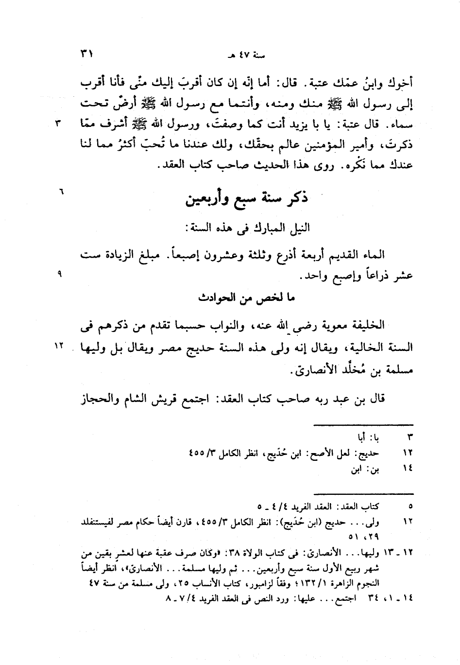 (12 - 13) وليها. . . الأنصارىّ: فى كتاب الولاة 38: «وكان صرف عقبة عنها لعشر بقين من شهر ربيع الأول سنة سبع وأربعين. . . ثم وليها مسلمة. . . الأنصارىّ»، انظر أيضا النجوم الزاهرة 1/ 132؛ وفقا لزامبور، كتاب الأنساب 25، ولى مسلمة من سنة 47