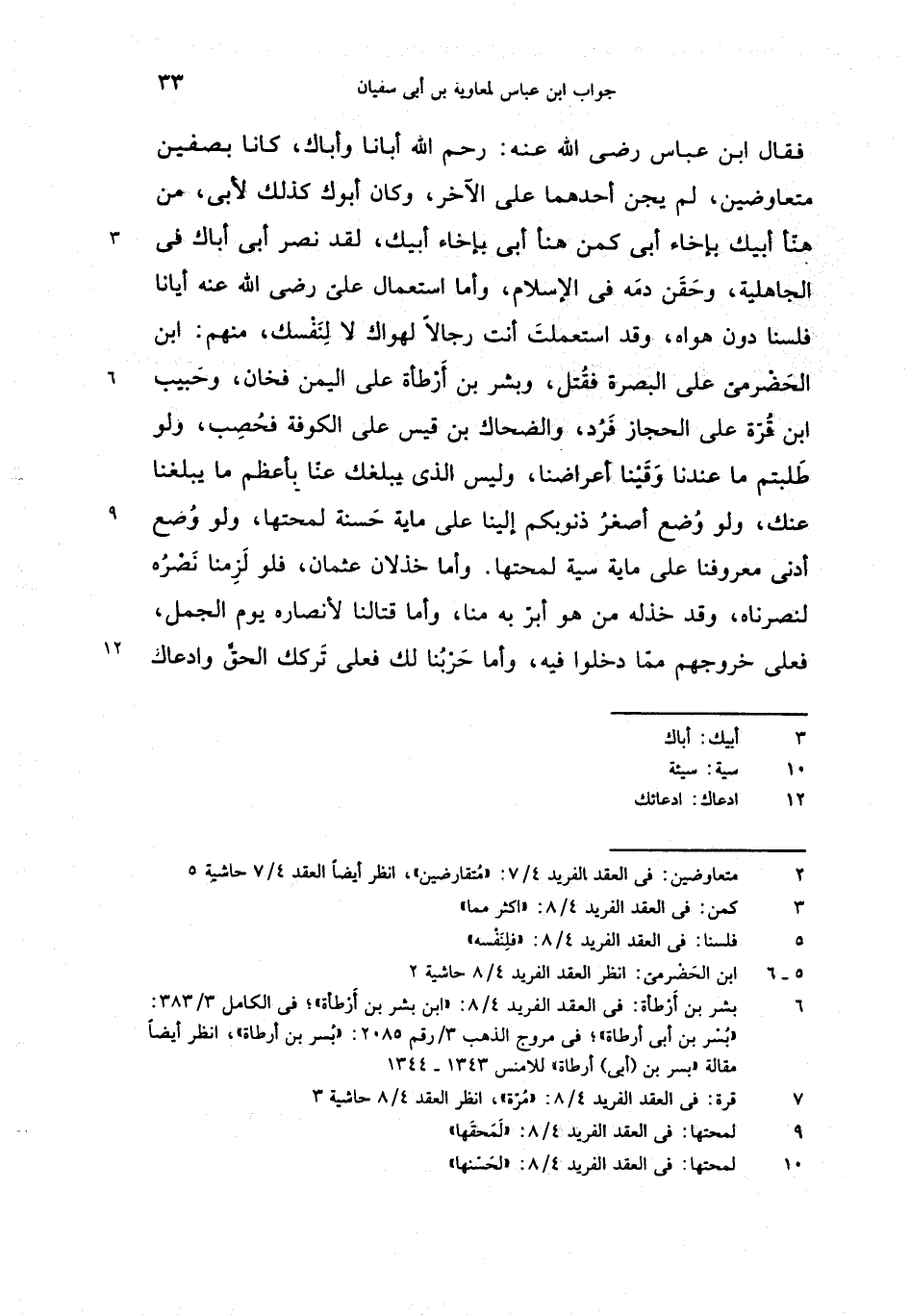 فقال ابن عباس رضى الله عنه: رحم الله أبانا وأباك، كانا بصفين متعاوضين، لم يجن أحدهما على الآخر، وكان أبوك كذلك لأبى، من هنّأ أبيك بإخاء أبى كمن هنأ أبى بإخاء أبيك، لقد نصر أبى أباك فى الجاهلية، وحقن دمه فى الإسلام، وأما استعمال علىّ رضى الله عنه أيانا فلسنا دون هواه، وقد استعملت أنت رجالا لهواك لا لنفسك، منهم: ابن الحضرمىّ على البصرة فقتل، وبشر بن أرطأة على اليمن فخان، وحبيب ابن قرّة على الحجاز فرد، والضحاك بن قيس على الكوفة فحصب، ولو طلبتم ما عندنا وقينا أعراضنا، وليس الذى يبلغك عنّا بأعظم ما يبلغنا عنك، ولو وضع أصغر ذنوبكم إلينا على ماية حسنة لمحتها، ولو وضع أدنى معروفنا على ماية سية لمحتها. وأما خذلان عثمان، فلو لزمنا نصره لنصرناه، وقد خذله من هو أبرّ به منا، وأما قتالنا لأنصاره يوم الجمل، فعلى خروجهم ممّا دخلوا فيه، وأما حربنا لك فعلى تركك الحقّ وادعاك