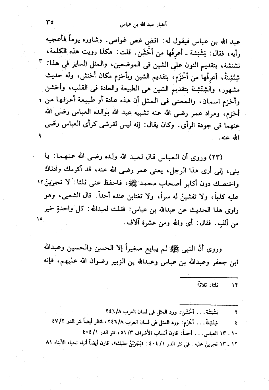 شنشنة، أعرفها من أخزم، بتقديم الشين وبأخزم مكان أخنش، وله حديث مشهور، والشنشنة بتقديم الشين هى الطبيعة والعادة فى القلب، وأخشن وأخزم اسمان، والمعنى فى المثل أن هذه عادة أو طبيعة أعرفها من أخزم، ومراد عمر رضى الله عنه تشبيه عبد الله بوالده العباس رضى الله عنهما فى جودة الرأى. وكان يقال: إنه ليس لقرشى كرأى العباس رضى الله عنه.