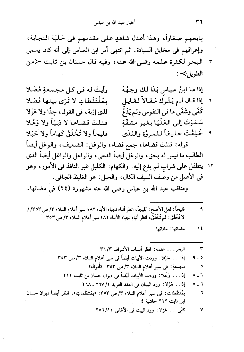 بايعهم صغارا، وهذا أعدل شاهد على مقدمهم فى حلبة النجابة، وإعراقهم فى مخايل السيادة. ثم انتهى أمر ابن العباس إلى أنه كان يسمى البحر لكثرة علمه رضى الله عنه، وفيه قال حسان بن ثابت <من الطويل>: