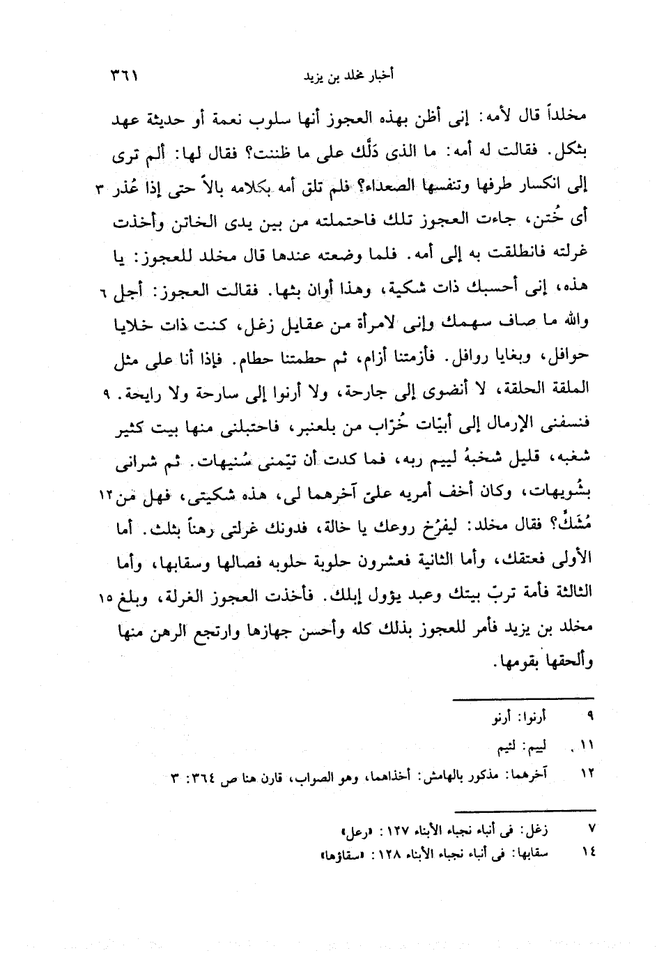 مخلدا قال لأمه: إنى أظن بهذه العجوز أنها سلوب نعمة أو حديثة عهد بثكل. فقالت له أمه: ما الذى دلّك على ما ظننت؟ فقال لها: ألم ترى إلى انكسار طرفها وتنفسها الصعداء؟ فلم تلق أمه بكلامه بالا حتى إذا عذر أى ختن، جاءت العجوز تلك فاحتملته من بين يدى الخاتن وأخذت غرلته فانطلقت به إلى أمه. فلما وضعته عندها قال مخلد للعجوز: يا هذه، إنى أحسبك ذات شكية، وهذا أوان بثها. فقالت العجوز: أجل والله ما صاف سهمك وإنى لامرأة من عقايل زغل، كنت ذات خلايا حوافل، وبغايا روافل. فأزمتنا أزام، ثم حطمتنا حطام. فإذا أنا على مثل الملقة الحلقة، لا أنضوى إلى جارحة، ولا أرنوا إلى سارحة ولا رايحة.