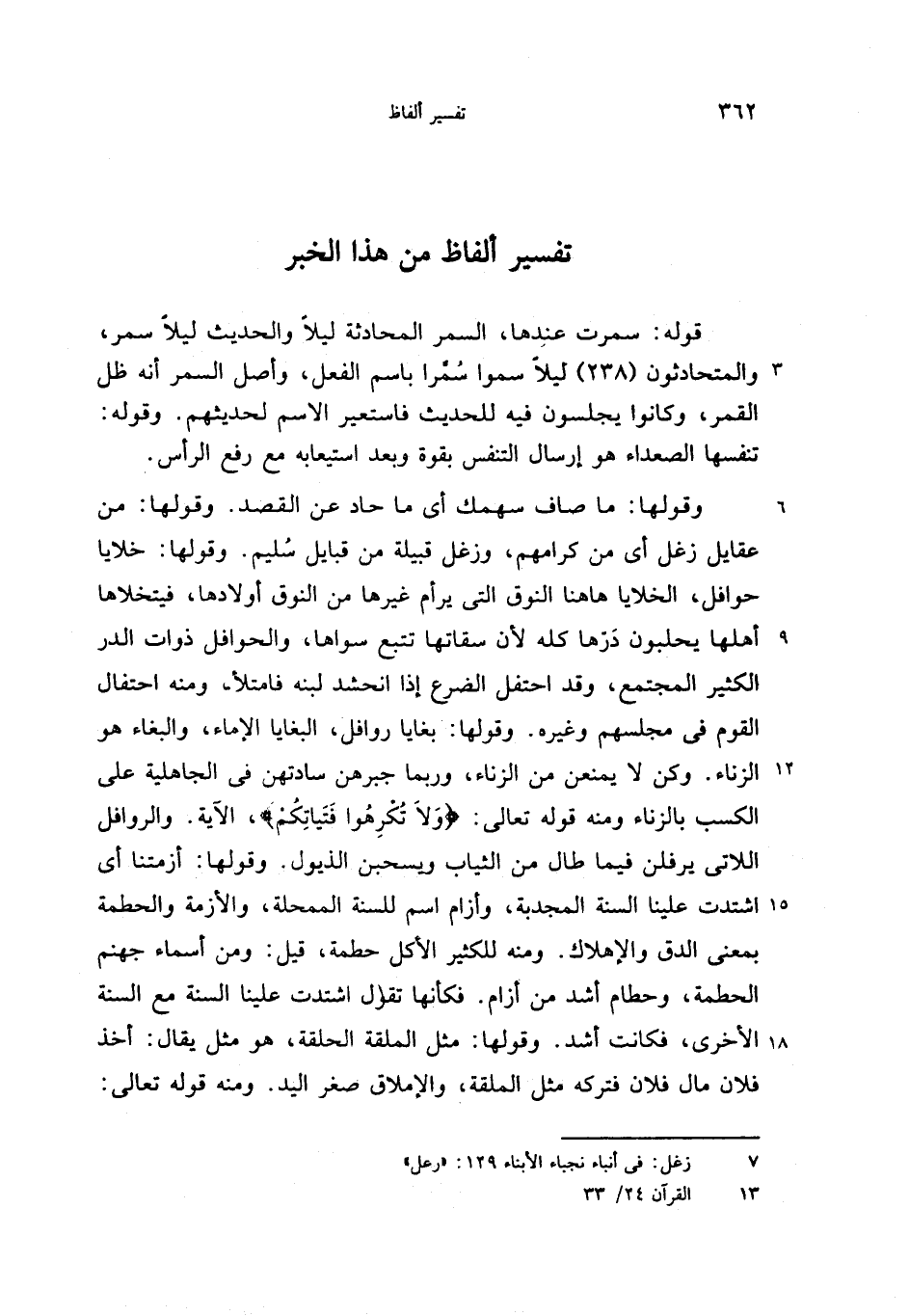 وقولها: ما صاف سهمك أى ما حاد عن القصد. وقولها: من عقايل زغل أى من كرامهم، وزغل قبيلة من قبايل سليم. وقولها: خلايا حوافل، الخلايا ها هنا النوق التى يرأم غيرها من النوق أولادها، فيتخلاها أهلها يحلبون درّها كله لأن سقاتها تتبع سواها، والحوافل ذوات الدر الكثير المجتمع، وقد احتفل الضرع إذا انحشد لبنه فامتلأ، ومنه احتفال القوم فى مجلسهم وغيره. وقولها: بغايا روافل، البغايا الإماء، والبغاء هو الزناء. وكن لا يمنعن من الزناء، وربما جبرهن سادتهن فى الجاهلية على الكسب بالزناء ومنه قوله تعالى: {وَلا تُكْرِهُوا فَتَياتِكُمْ}، الآية. والروافل اللاتى يرفلن فيما طال من الثياب ويسحبن الذيول. وقولها: أزمتنا أى اشتدت علينا السنة المجدبة، وأزام اسم للسنة الممحلة، والأزمة والحطمة بمعنى الدق والإهلاك. ومنه للكثير الأكل حطمة، قيل: ومن أسماء جهنم الحطمة، وحطام أشد من أزام. فكأنها تقول اشتدت علينا السنة مع السنة الأخرى، فكانت أشد. وقولها: مثل الملقة الحلقة، هو مثل يقال: أخذ فلان مال فلان فتركه مثل الملقة، والإملاق صغر اليد. ومنه قوله تعالى: