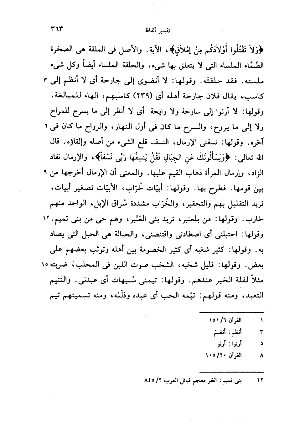 {وَلا تَقْتُلُوا أَوْلادَكُمْ مِنْ إِمْلاقٍ}، الآية. والأصل فى الملقة هى الصخرة الصّمّاء الملساء التى لا يتعلق بها شئ، والحلقة الملساء أيضا وكل شئ ملسته. فقد حلقته. وقولها: لا أنضوى إلى جارحة أى لا أنظم إلى كاسب، يقال فلان جارحة أهله أى (239) كاسبهم، الهاء للمبالغة.