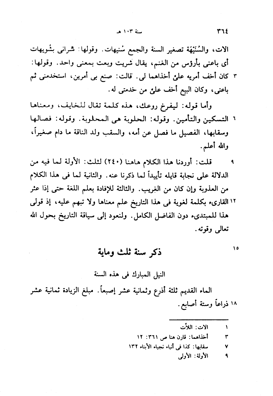 قلت: أوردنا هذا الكلام ها هنا (240) لثلث: الأولة لما فيه من الدلالة على نجابة قايله تأييدا لما ذكرنا عنه. والثانية لما فى هذا الكلام من العذوبة وإن كان من الغريب. والثالثة للإفادة بعلم اللغة حتى إذا عثر القارئ بكلمة لغوية فى هذا التاريخ علم معناها ولا تبهم عليه، إذ قولى هذا للمبتدئ دون الفاضل الكامل. ولنعود إلى سياقة التاريخ بحول الله تعالى وقوته.