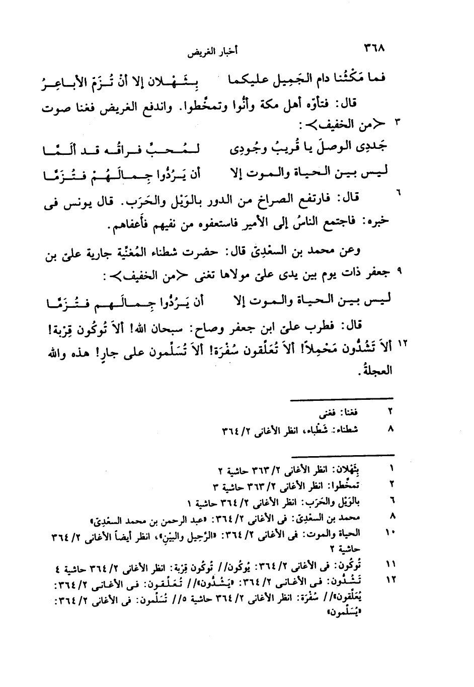 (10) الحياة والموت: فى الأغانى 2/ 364: «الرّحيل والبين»، انظر أيضا الأغانى 2/ 364 حاشية 2